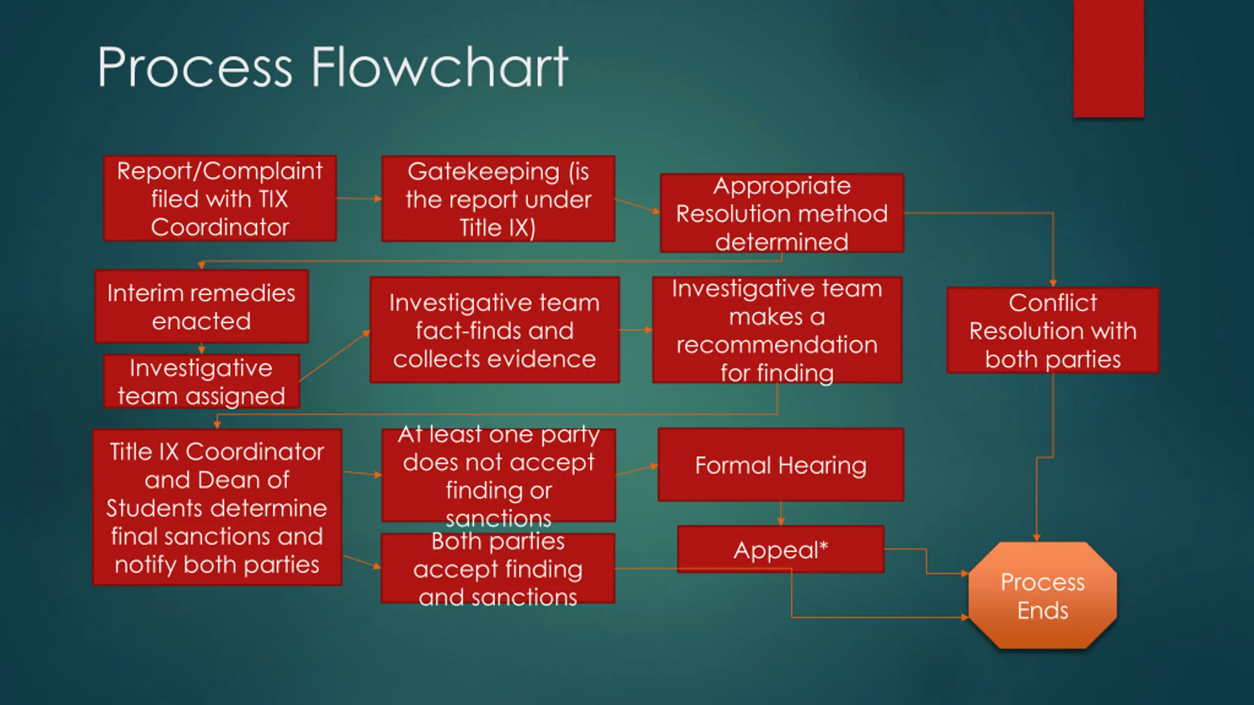 Process Flowchart Report/Complaint filed with TIX Coordinator Gatekeeping (is the report under Title IX) Appropriate Resolution method determined Investigative team makes a recommendation for finding Interim remedies enacted Investigative team fact-finds and collects evidence Conflict Resolution with both parties Investigative team assigned At least one party does not accept finding or sanctions Title IX Coordinator and Dean of Students determine final sanctions and notify both parties Formal Hearing Both parties accept finding and sanctions Appeal* Process Ends