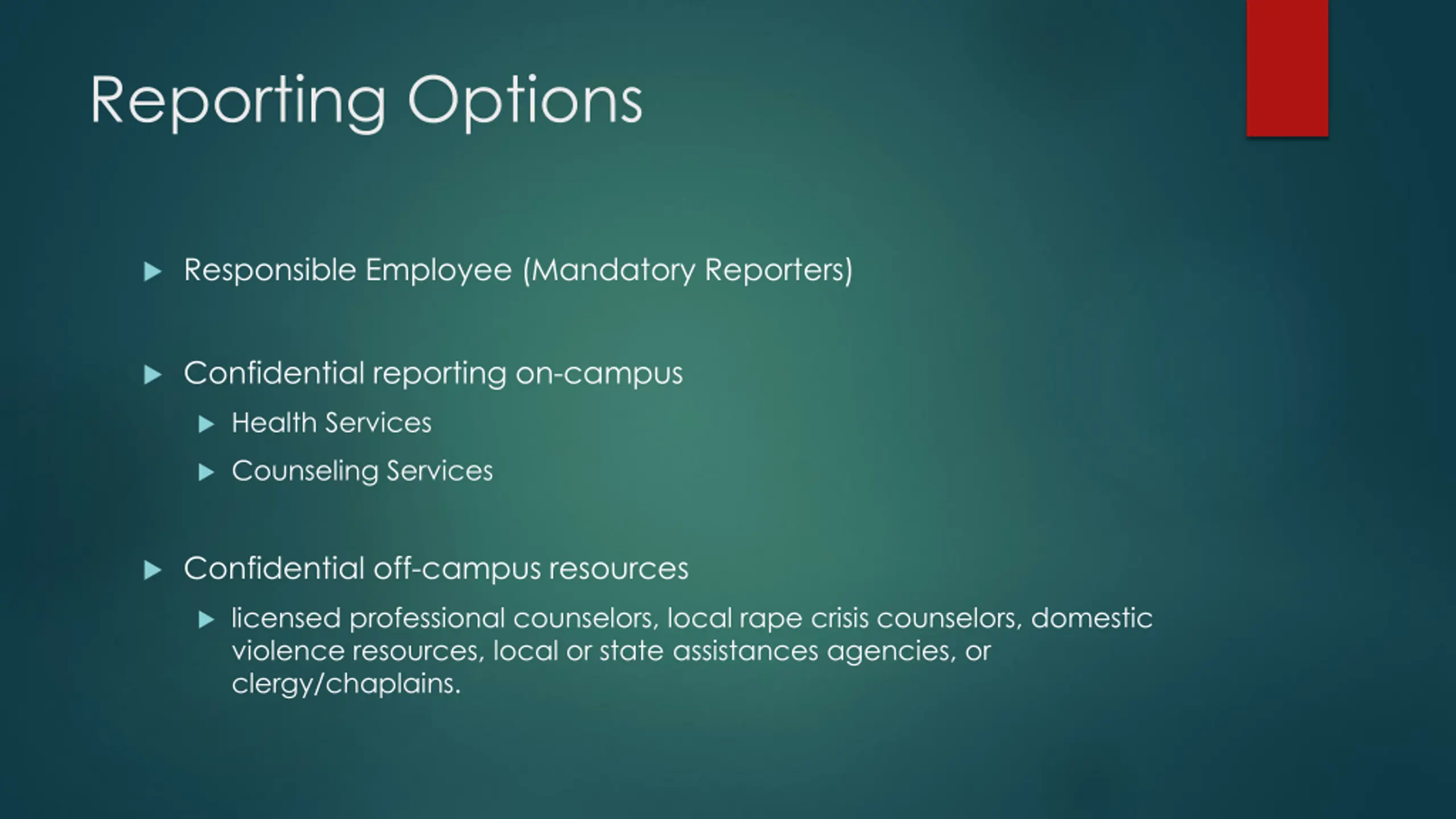 Reporting Options Responsible Employee (Mandatory Reporters) Confidential reporting on-campus Health Services Counseling Services Confidential off-campus resources licensed professional counselors, local rape crisis counselors, domestic violence resources, local or state assistances agencies, or clergy/chaplains.