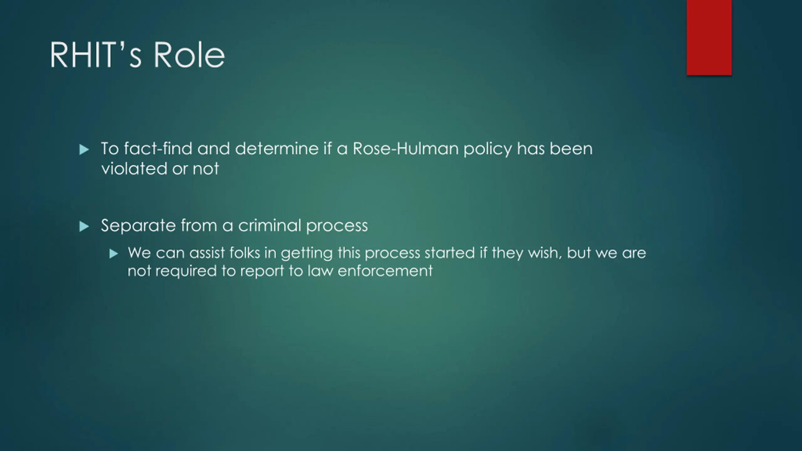 RHITs Role To fact-find and determine if a Rose-Hulman policy has been violated or not Separate from a criminal process We can assist folks in getting this process started if they wish, but we are not required to report to law enforcement