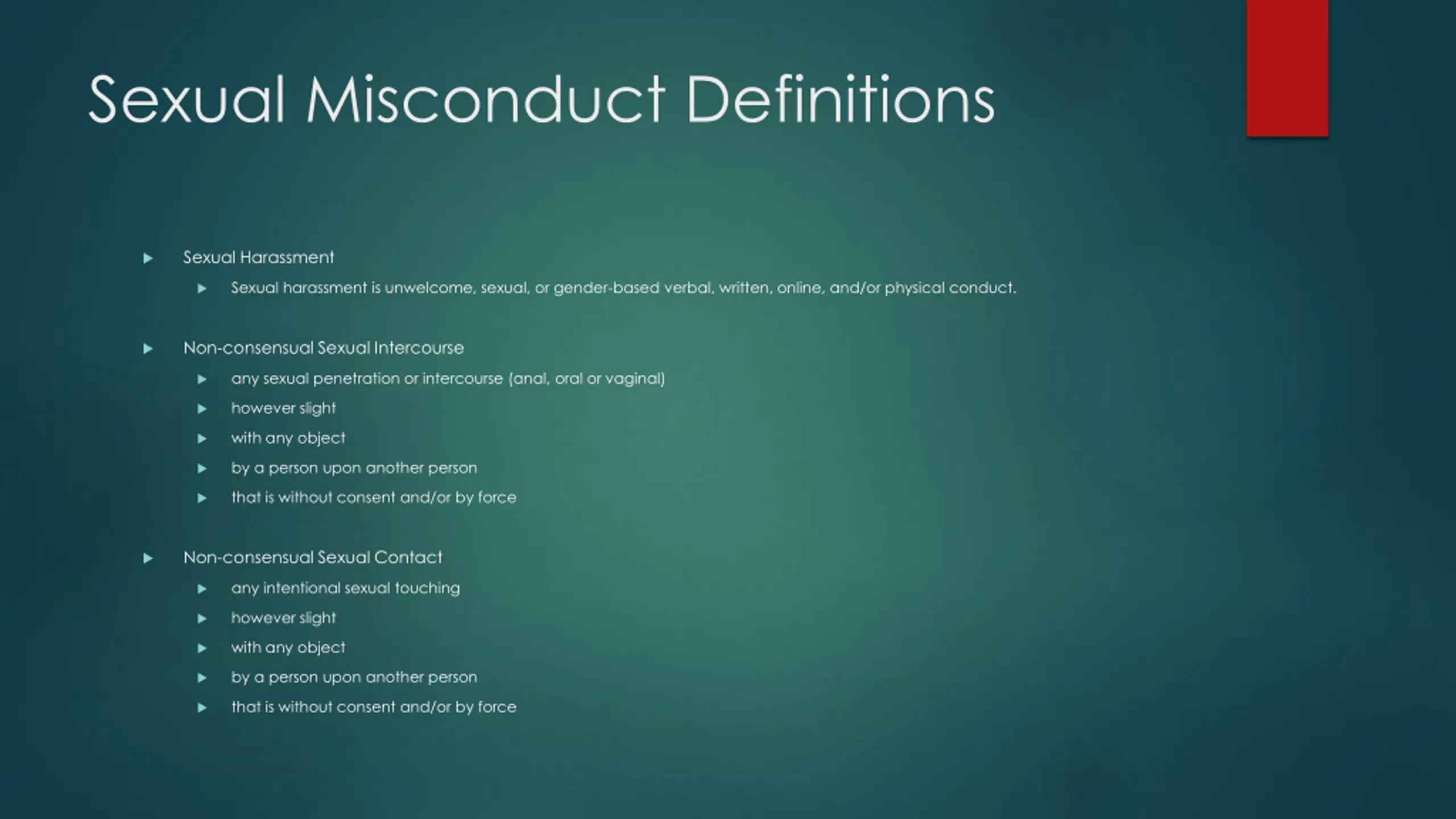 Sexual Misconduct Definitions Sexual Harassment Sexual harassment is unwelcome, sexual, or gender-based verbal, written, online, and/or physical conduct. Non-consensual Sexual Intercourse any sexual penetration or intercourse (anal, oral or vaginal) however slight with any object by a person upon another person that is without consent and/or by force Non-consensual Sexual Contact any intentional sexual touching however slight with any object by a person upon another person that is without consent and/or by force
