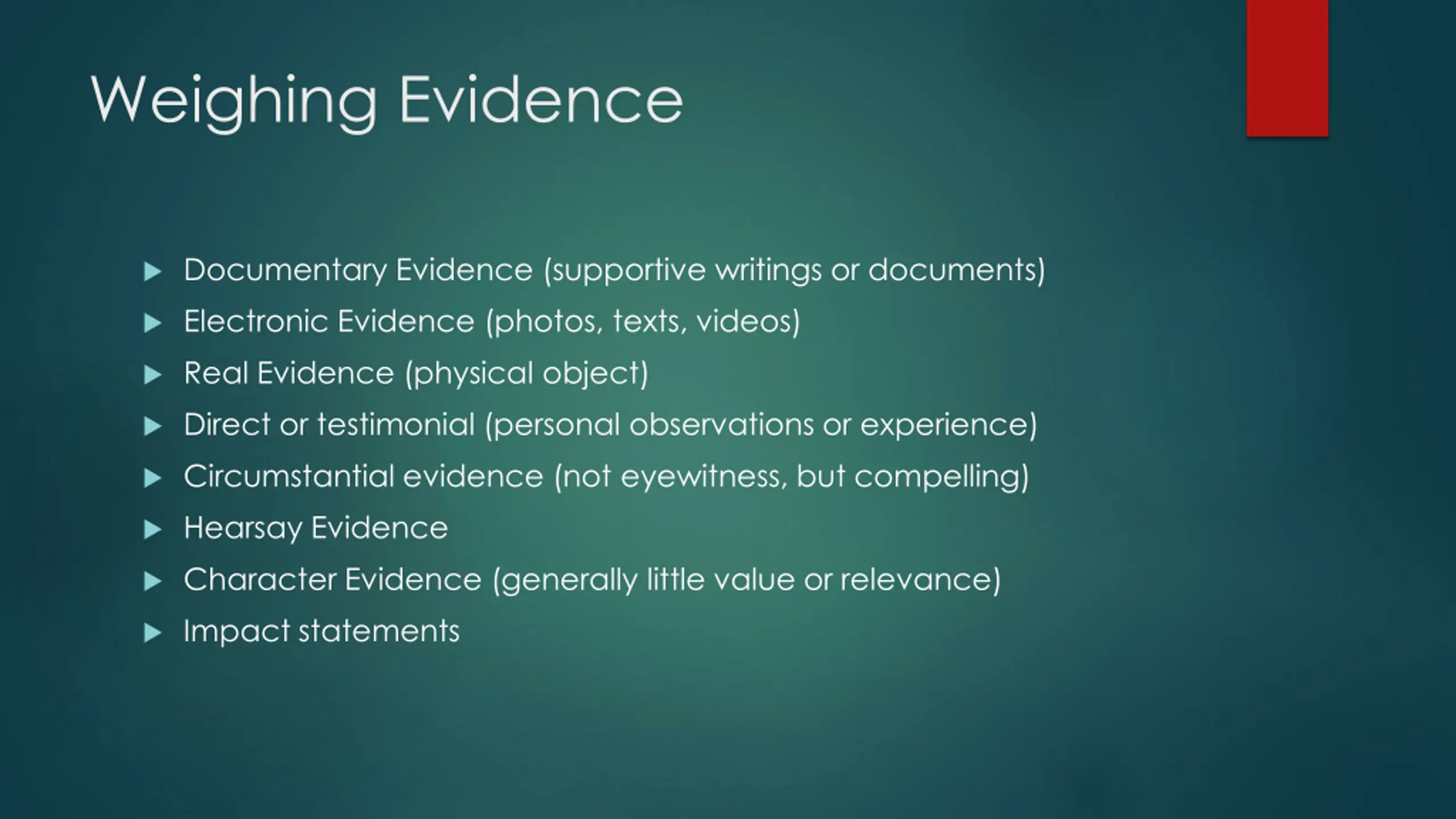 Weighing Evidence Documentary Evidence (supportive writings or documents) Electronic Evidence (photos, texts, videos) Real Evidence (physical object) Direct or testimonial (personal observations or experience) Circumstantial evidence (not eyewitness, but compelling) Hearsay Evidence Character Evidence (generally little value or relevance) Impact statements