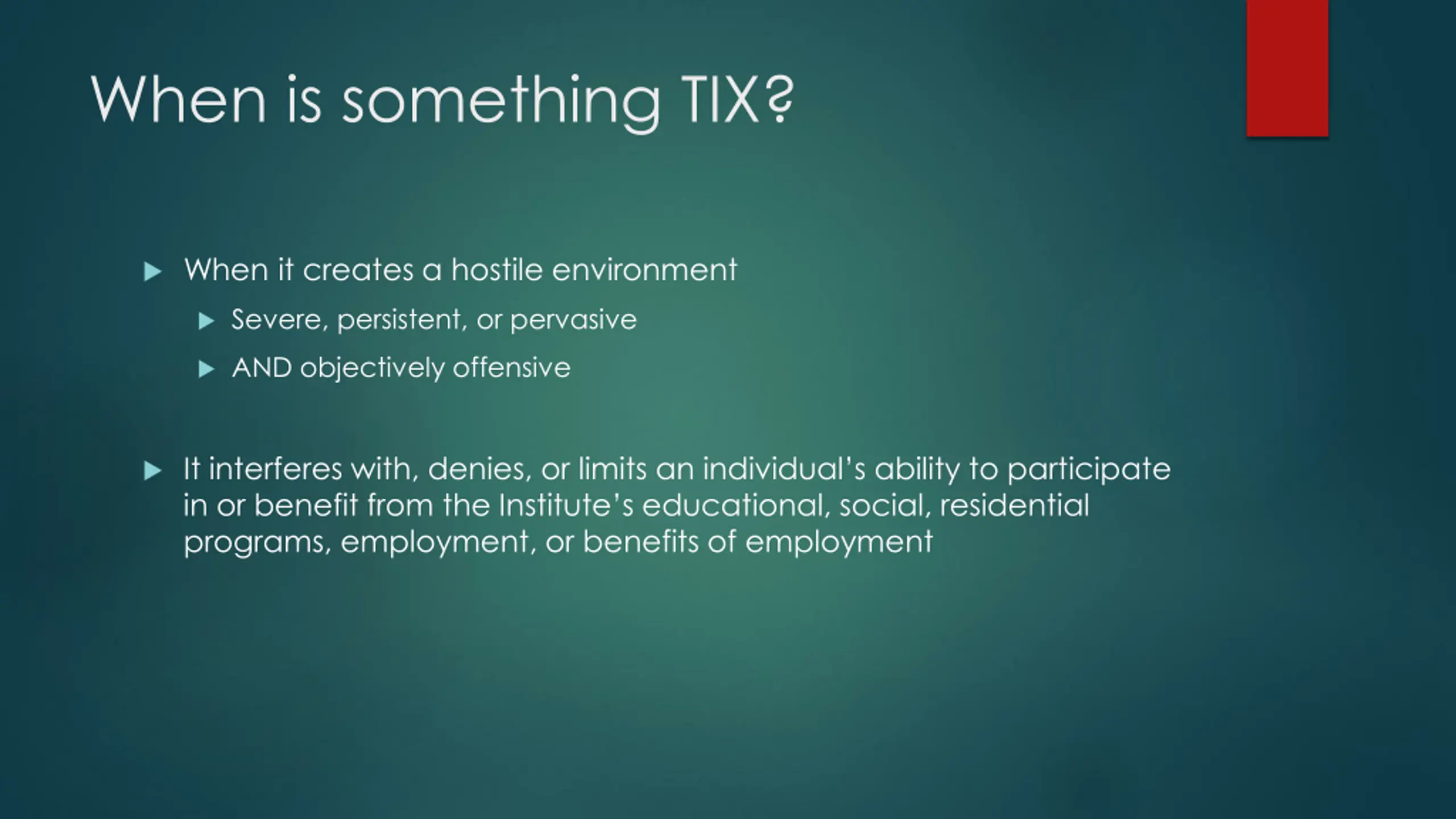 When is something TIX? When it creates a hostile environment Severe, persistent, or pervasive AND objectively offensive It interferes with, denies, or limits an individual s ability to participate in or benefit from the Institute s educational, social, residential programs, employment, or benefits of employment
