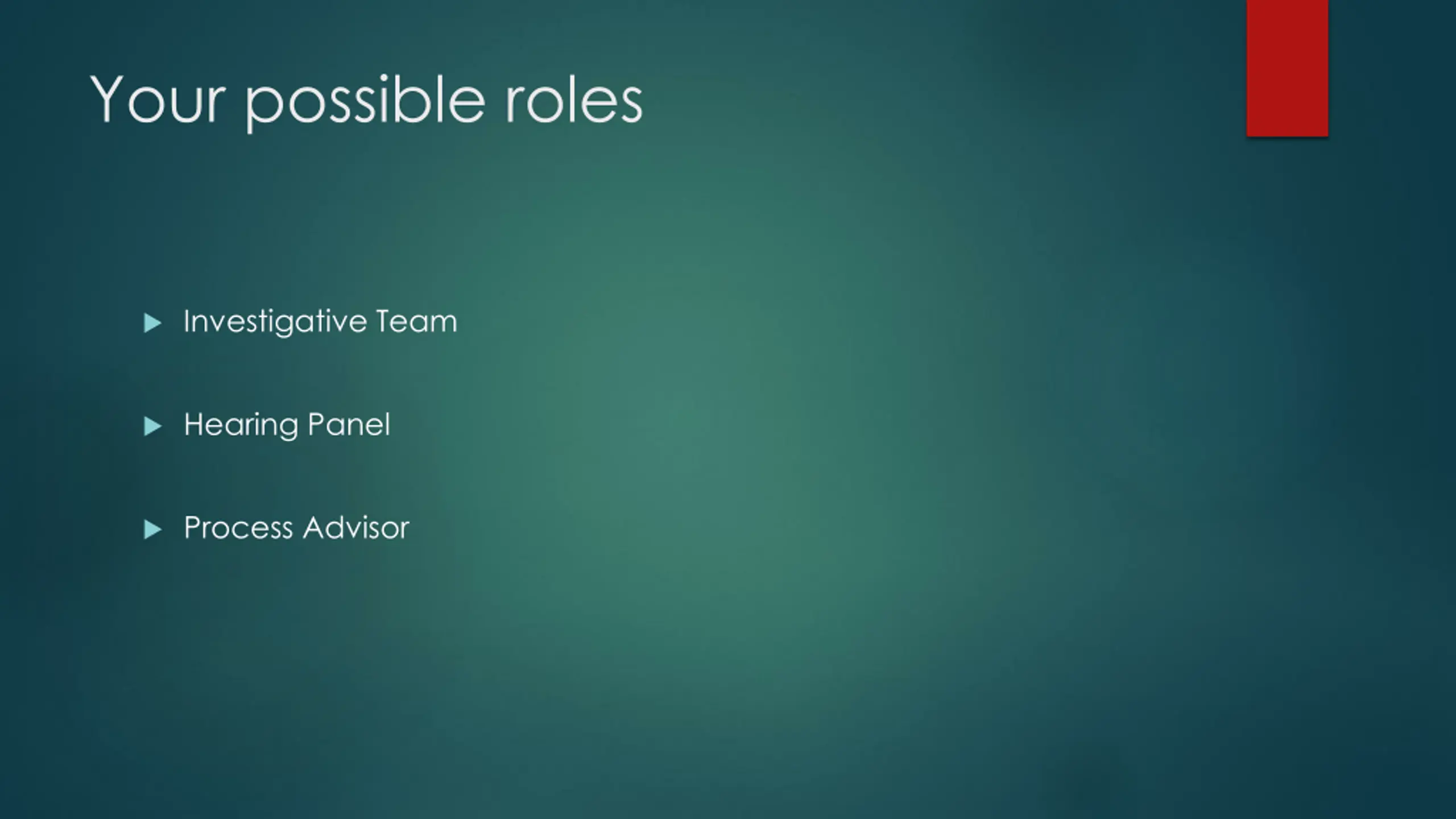 Your possible roles Investigative Team Hearing Panel Process Advisor