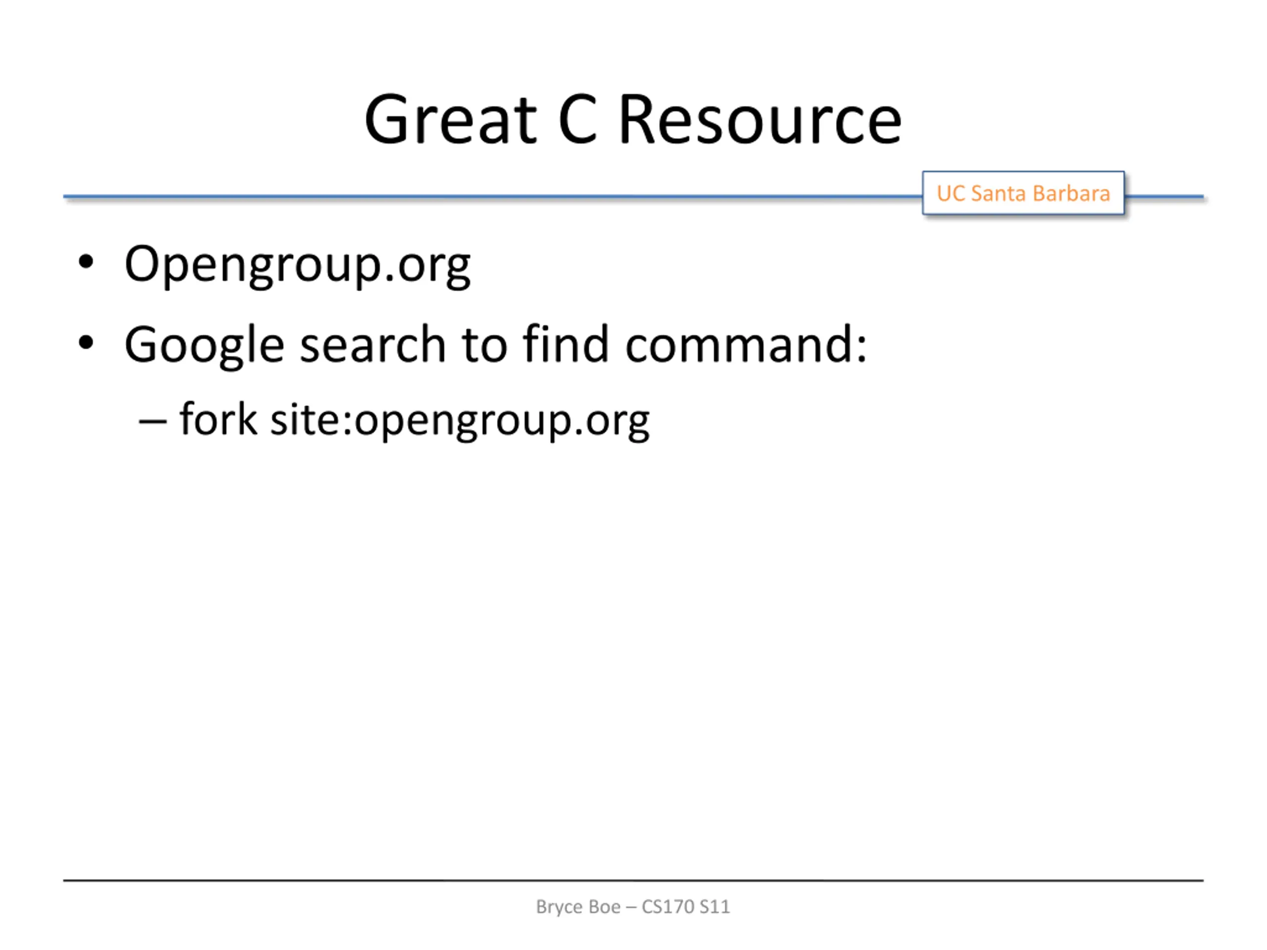 Great C Resource UC Santa Barbara Opengroup.org Google search to find command: fork site:opengroup.org Bryce Boe CS170 S11
