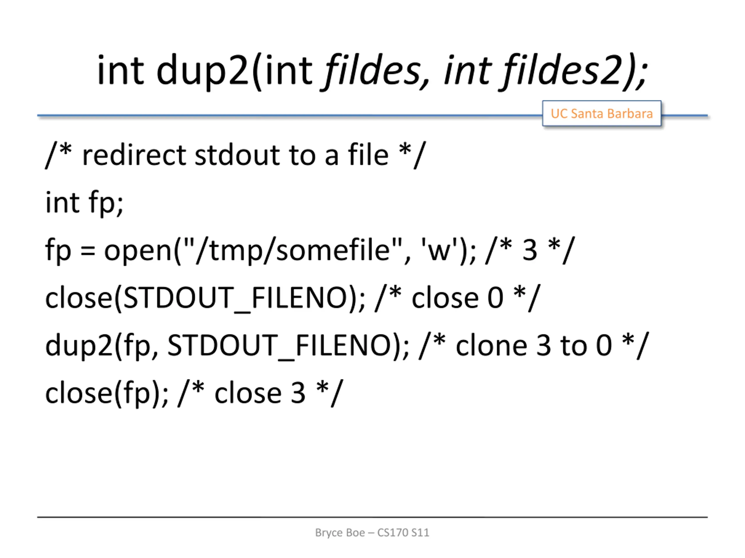int dup2(int fildes, int fildes2); UC Santa Barbara /* redirect stdout to a file */ int fp; fp = open("/tmp/somefile", 'w'); /* 3 */ close(STDOUT_FILENO); /* close 0 */ dup2(fp, STDOUT_FILENO); /* clone 3 to 0 */ close(fp); /* close 3 */ Bryce Boe CS170 S11