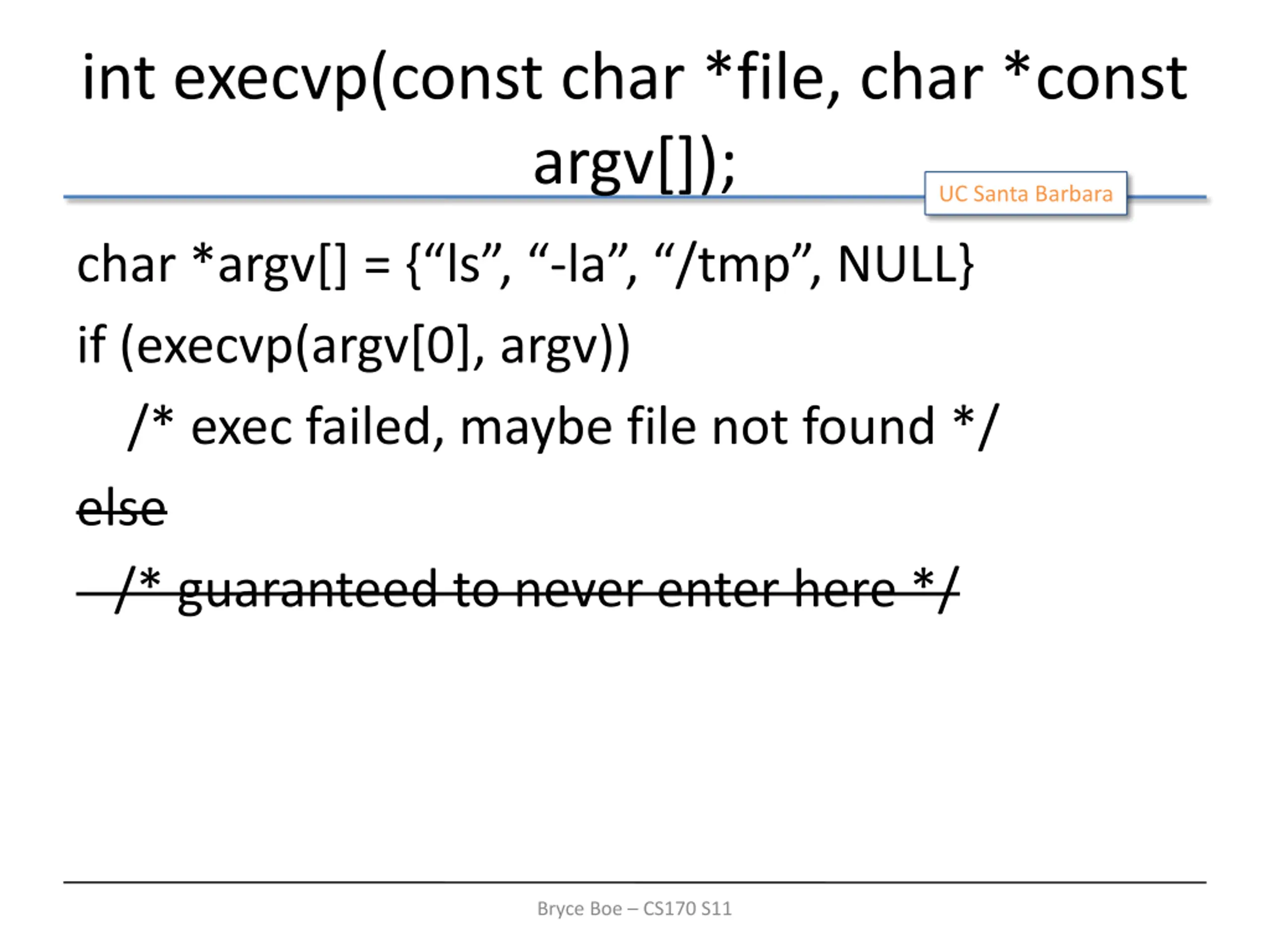 int execvp(const char *file, char *const argv[]); UC Santa Barbara char *argv[] = { ls , -la , /tmp , NULL} if (execvp(argv[0], argv)) /* exec failed, maybe file not found */ else /* guaranteed to never enter here */ Bryce Boe CS170 S11