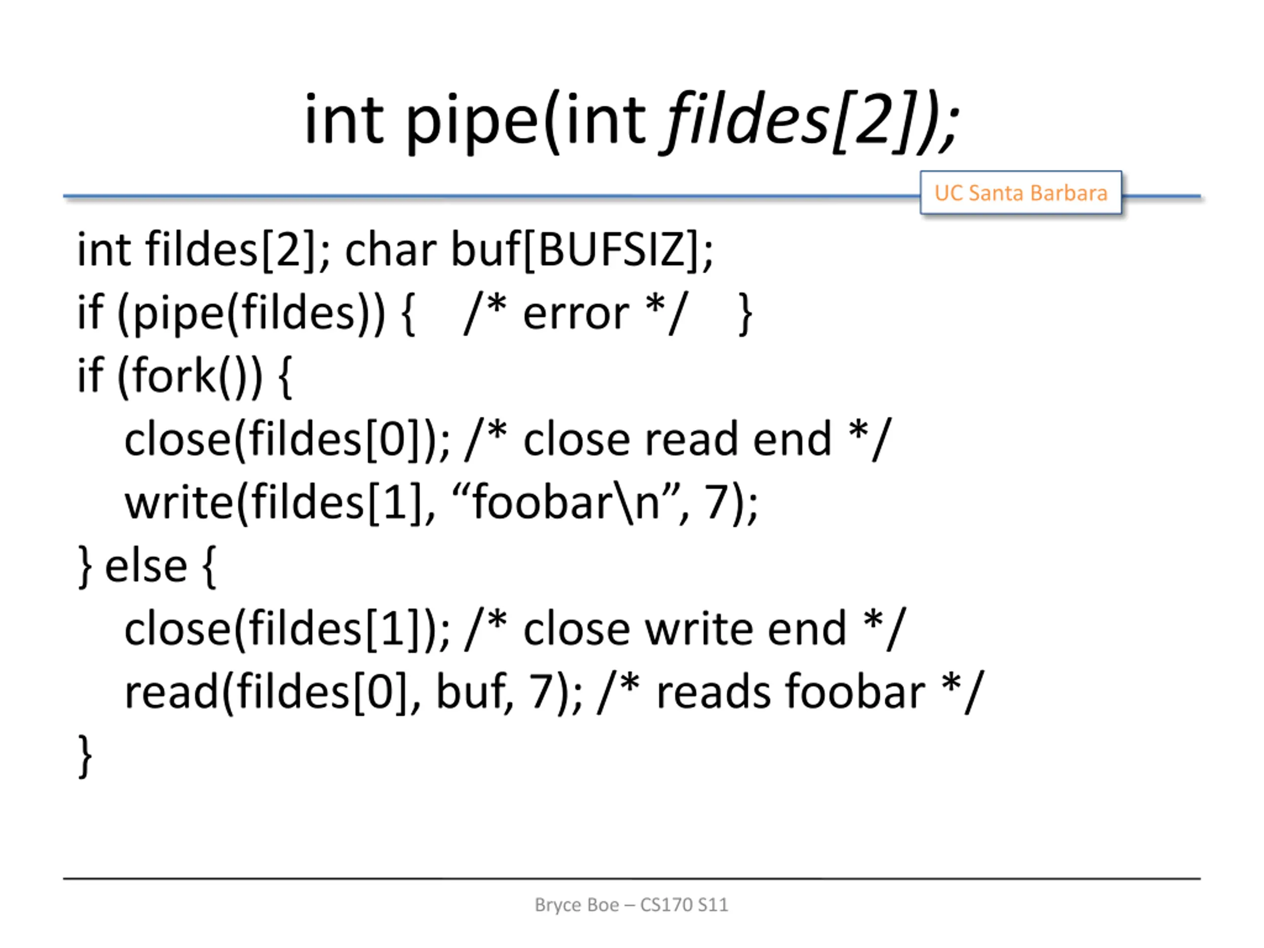 int pipe(int fildes[2]); UC Santa Barbara int fildes[2]; char buf[BUFSIZ]; if (pipe(fildes)) { /* error */ } if (fork()) { close(fildes[0]); /* close read end */ write(fildes[1], foobar\n , 7); } else { close(fildes[1]); /* close write end */ read(fildes[0], buf, 7); /* reads foobar */ } Bryce Boe CS170 S11