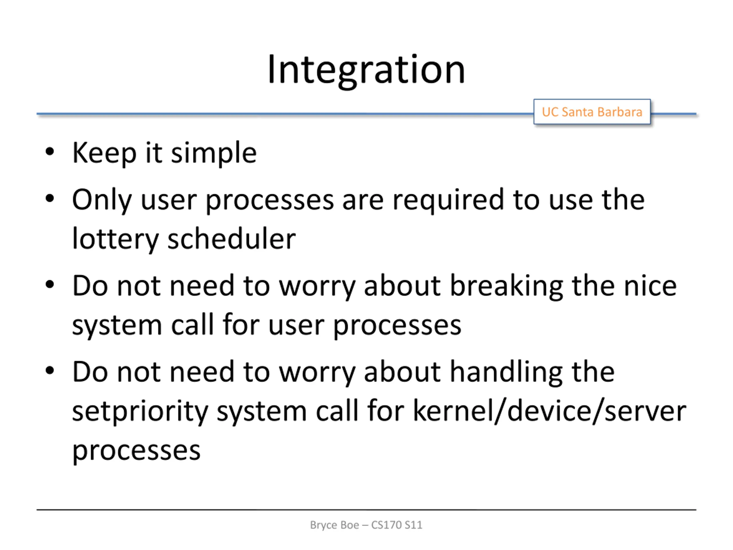 Integration UC Santa Barbara Keep it simple Only user processes are required to use the lottery scheduler Do not need to worry about breaking the nice system call for user processes Do not need to worry about handling the setpriority system call for kernel/device/server processes Bryce Boe CS170 S11