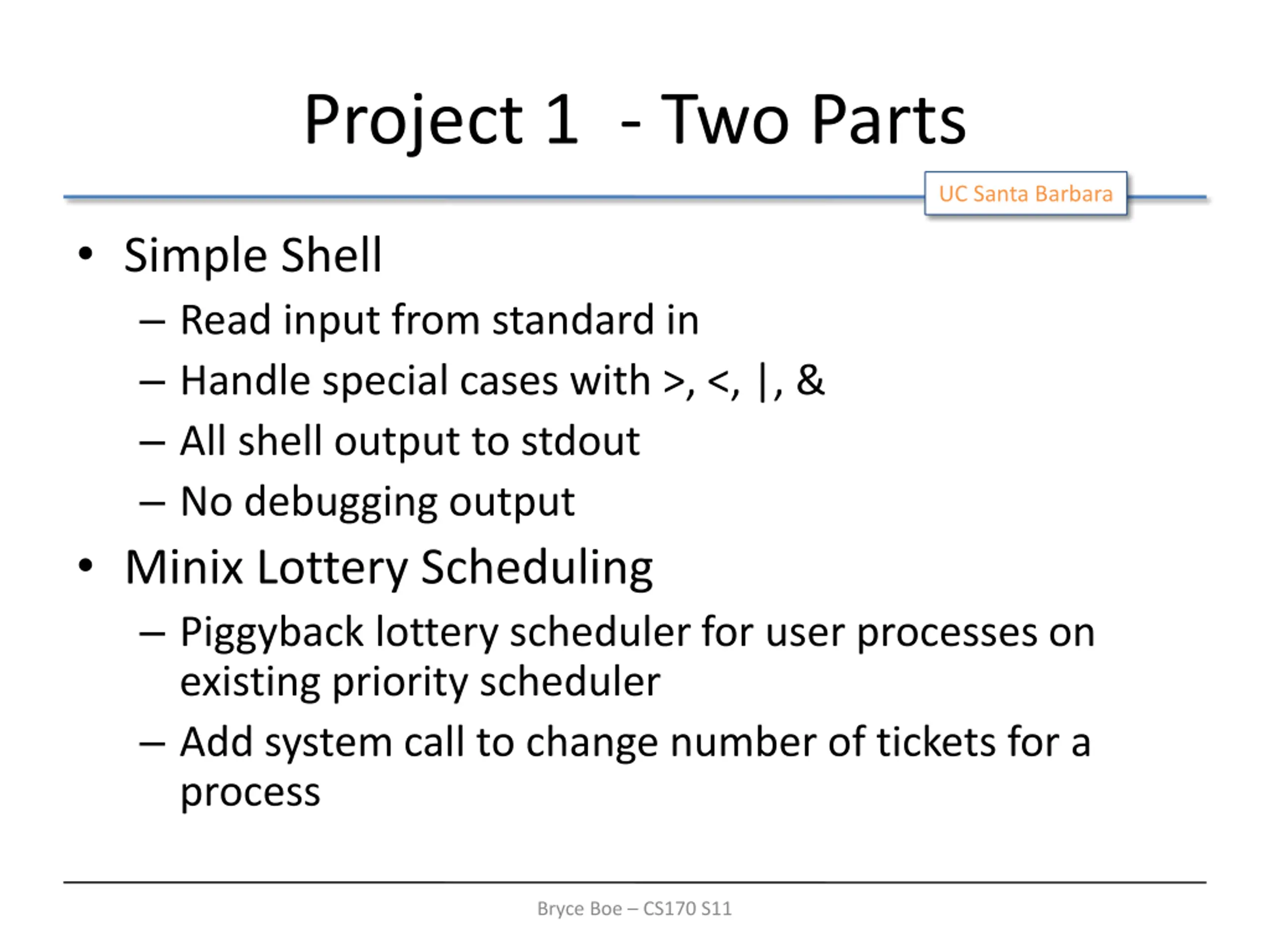 Project 1 - Two Parts UC Santa Barbara Simple Shell Read input from standard in Handle special cases with >, <, |, & All shell output to stdout No debugging output Minix Lottery Scheduling Piggyback lottery scheduler for user processes on existing priority scheduler Add system call to change number of tickets for a process Bryce Boe CS170 S11