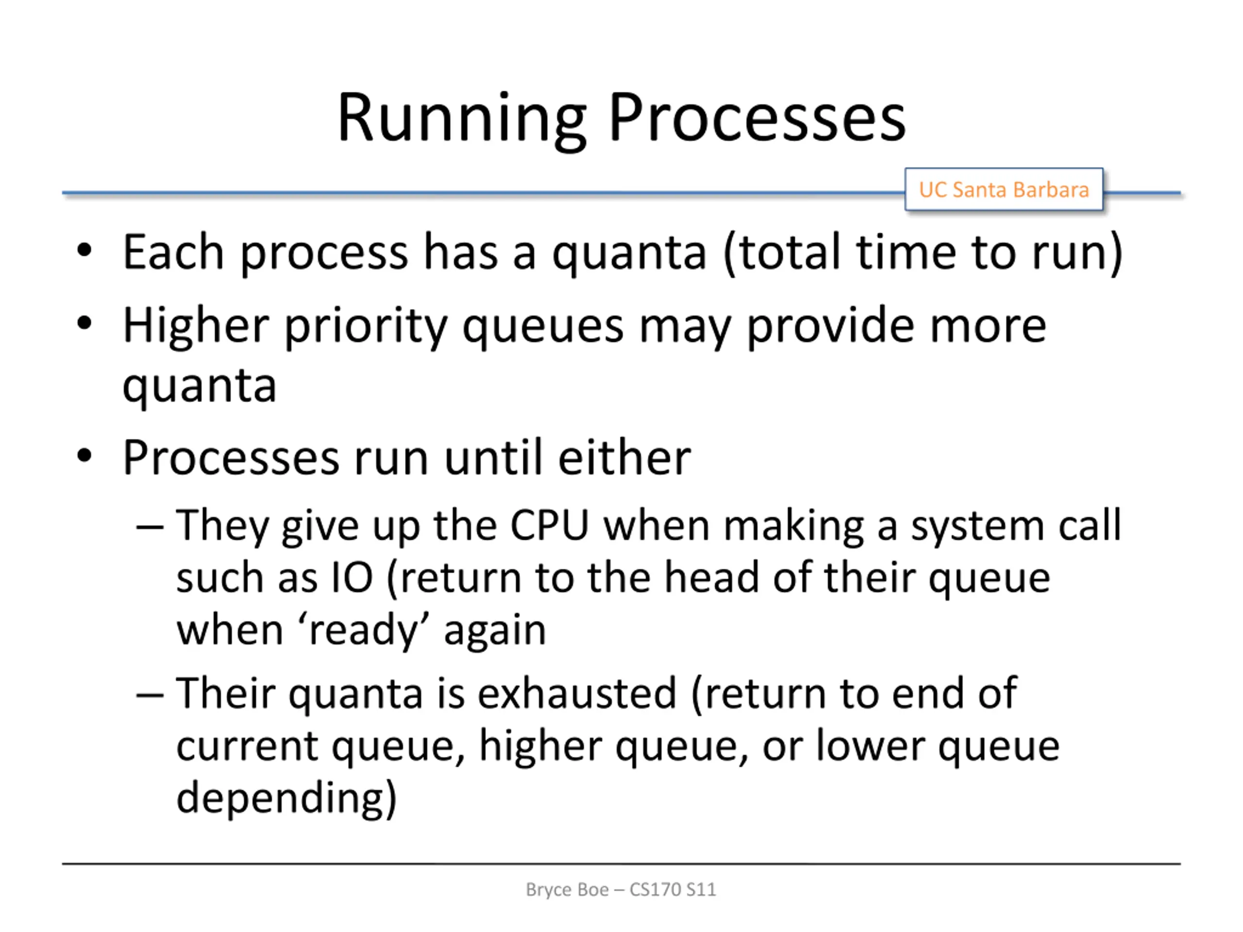 Running Processes UC Santa Barbara Each process has a quanta (total time to run) Higher priority queues may provide more quanta Processes run until either They give up the CPU when making a system call such as IO (return to the head of their queue when ready again Their quanta is exhausted (return to end of current queue, higher queue, or lower queue depending) Bryce Boe CS170 S11