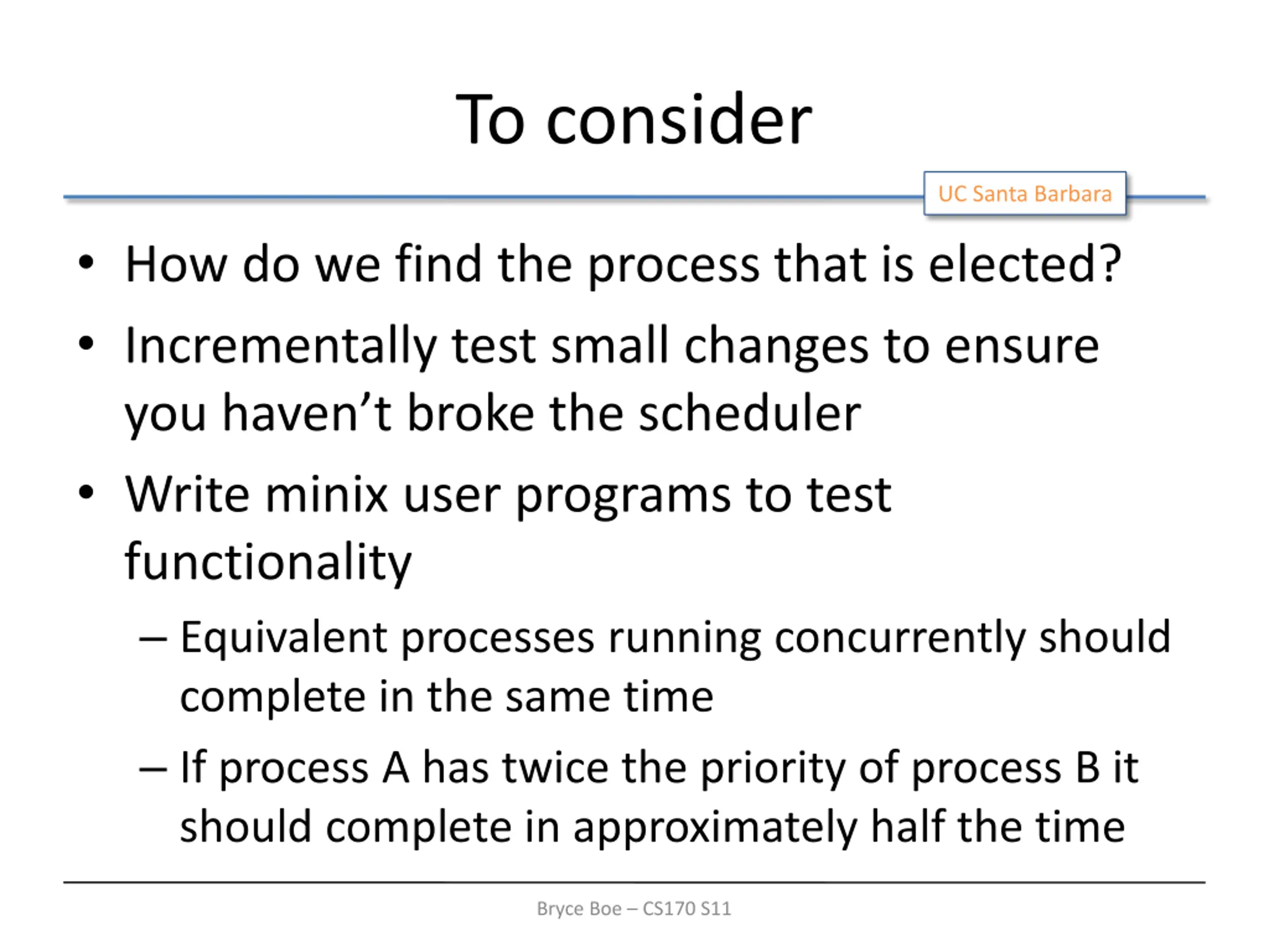 To consider UC Santa Barbara How do we find the process that is elected? Incrementally test small changes to ensure you haven t broke the scheduler Write minix user programs to test functionality Equivalent processes running concurrently should complete in the same time If process A has twice the priority of process B it should complete in approximately half the time Bryce Boe CS170 S11