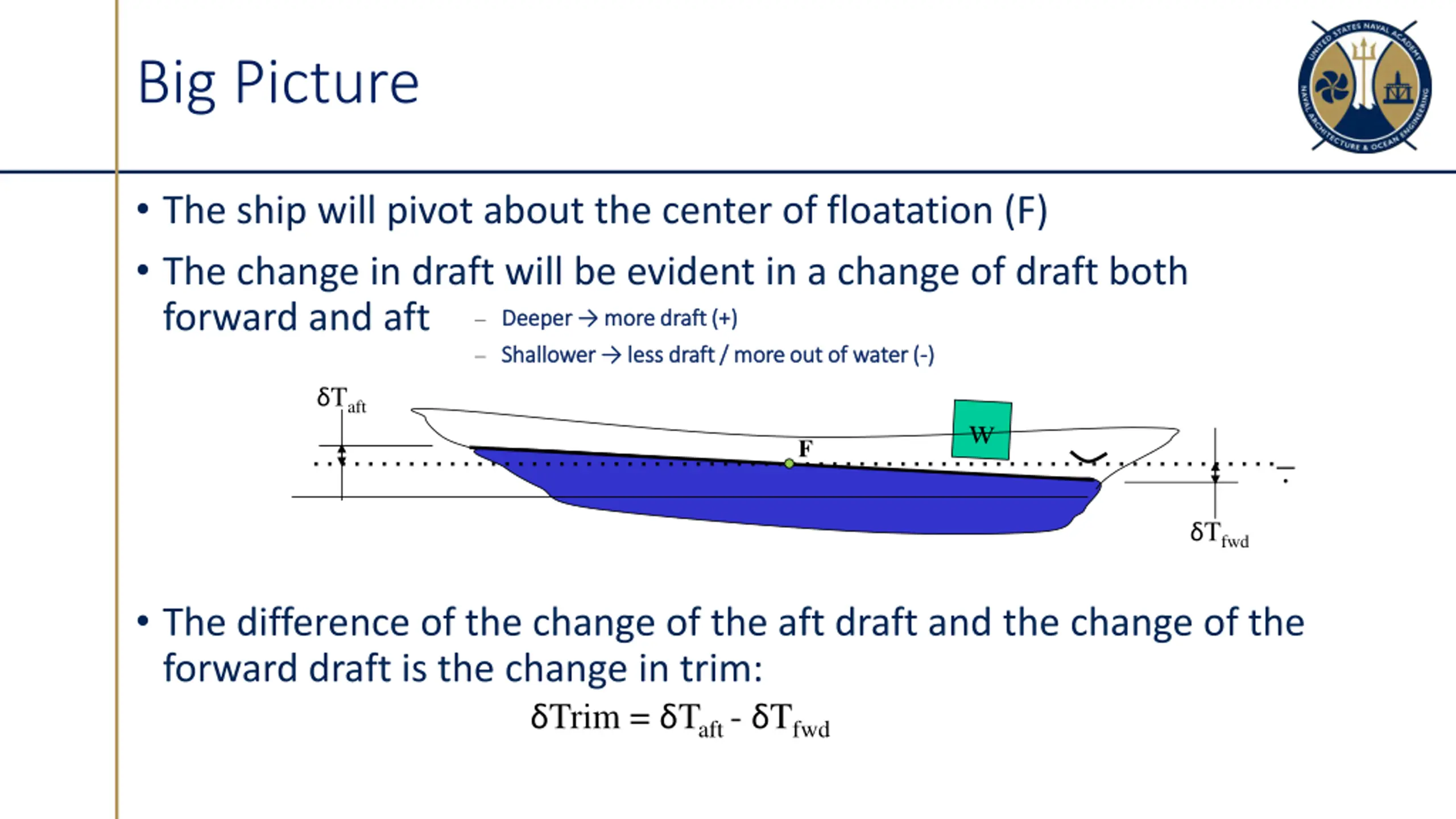 Big Picture The ship will pivot about the center of floatation (F) The change in draft will be evident in a change of draft both forward and aft Deeper more draft (+) Shallower less draft / more out of water ( Shallower less draft / more out of water (- -) ) Deeper more draft (+) Taft _. F Tfwd The difference of the change of the aft draft and the change of the forward draft is the change in trim: Trim = Taft - Tfwd