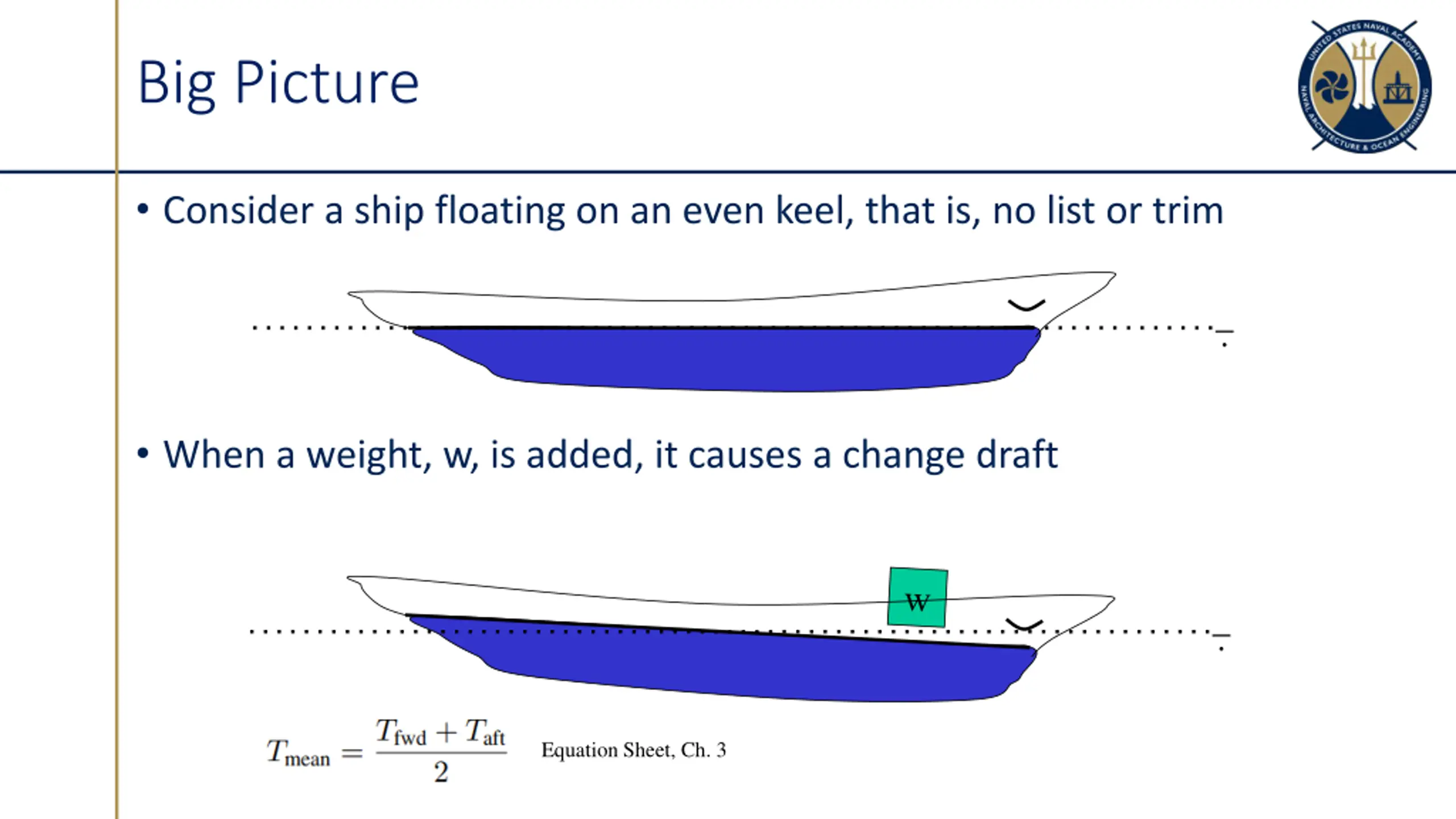 Big Picture Consider a ship floating on an even keel, that is, no list or trim _. When a weight, w, is added, it causes a change draft _. Equation Sheet, Ch. 3