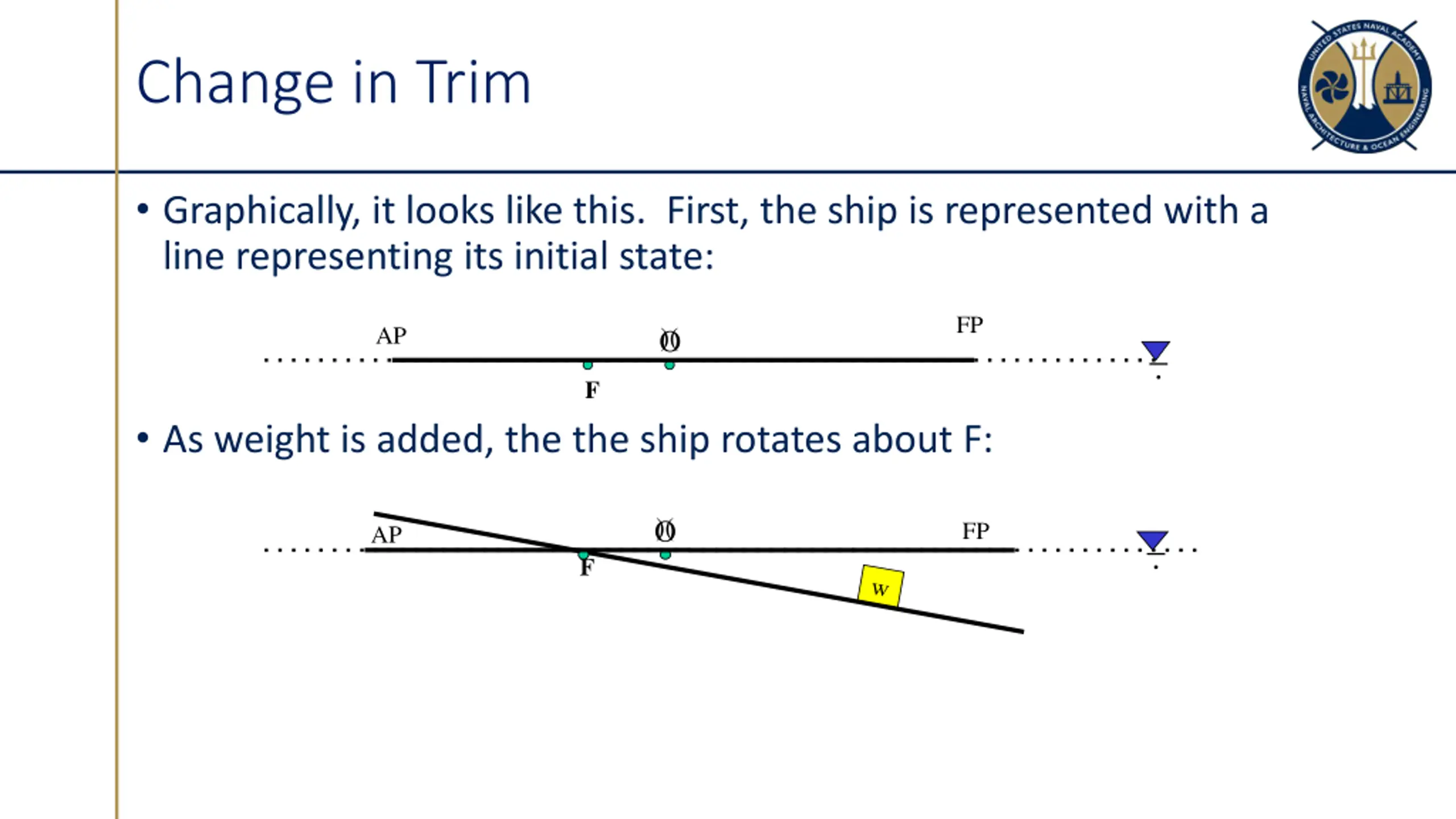 Change in Trim Graphically, it looks like this. First, the ship is represented with a line representing its initial state: FP AP O )( _. F As weight is added, the the ship rotates about F: O )( FP _. AP F