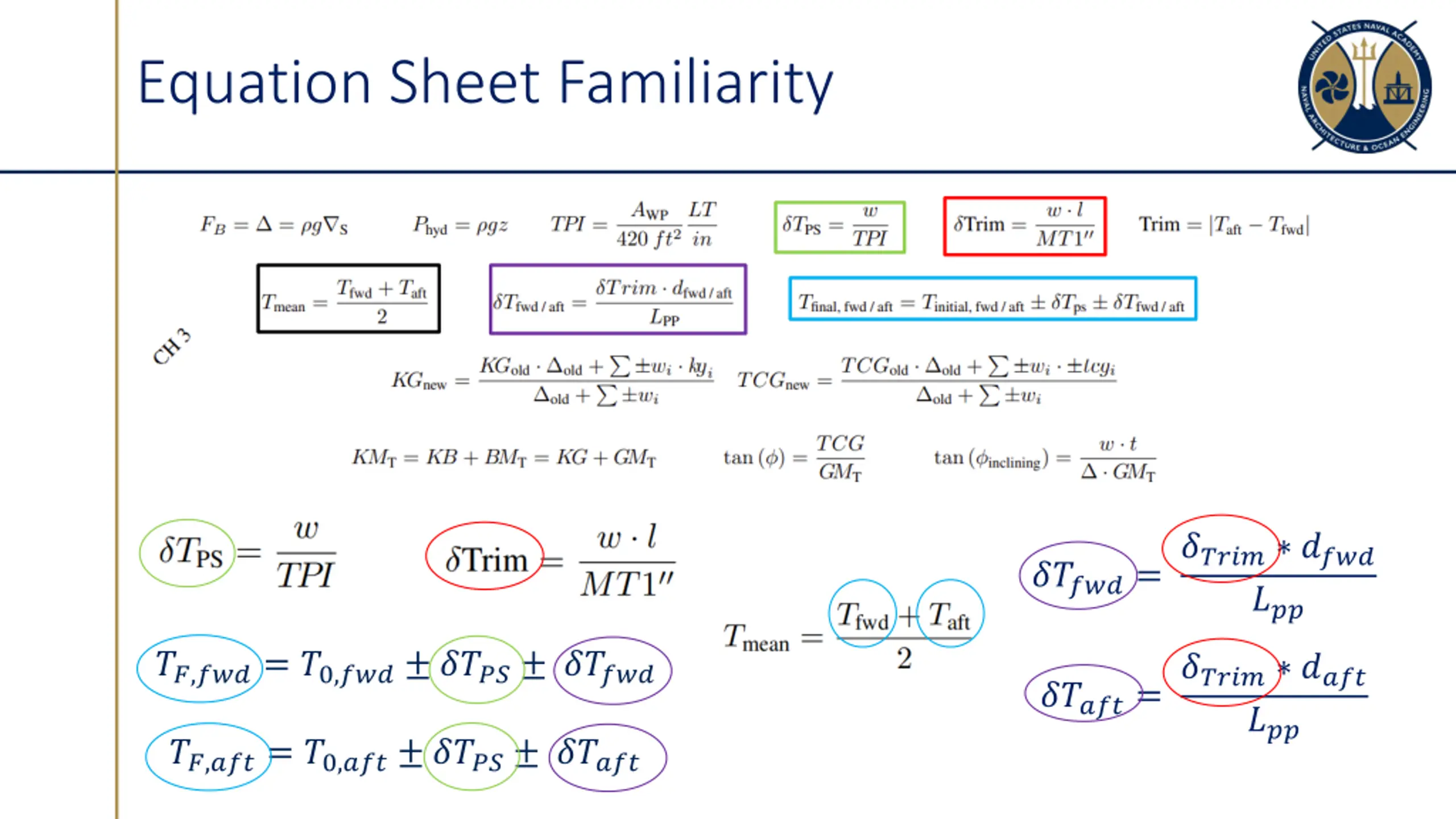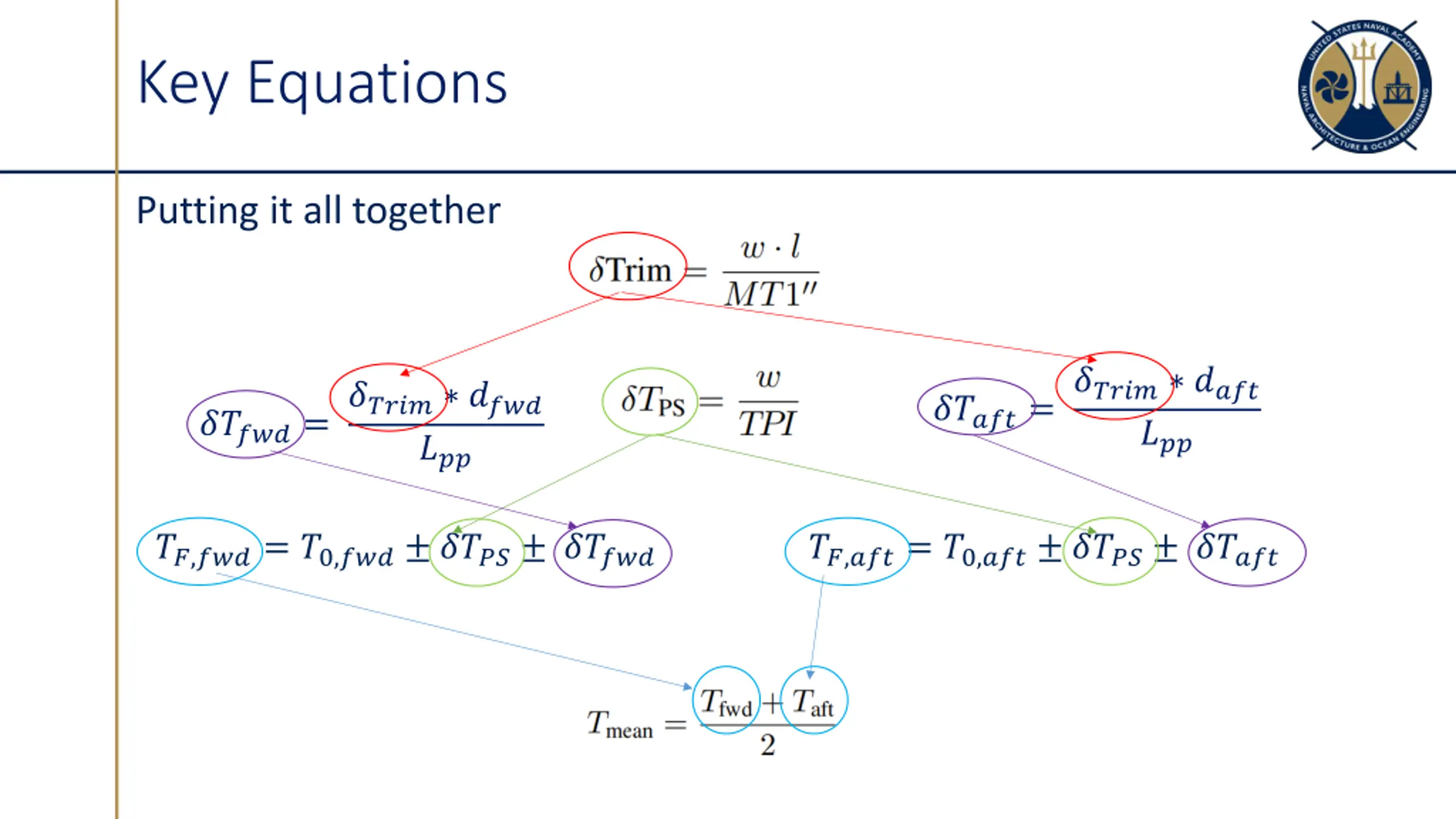 Key Equations The calculation for change in trim can then be used to calculate a change in draft both forward and aft: ????? ???? ??? ????? ???? ??? ?????= ?????= Equation Sheet, Ch. 3, combined into 1 equation with these 2 applications