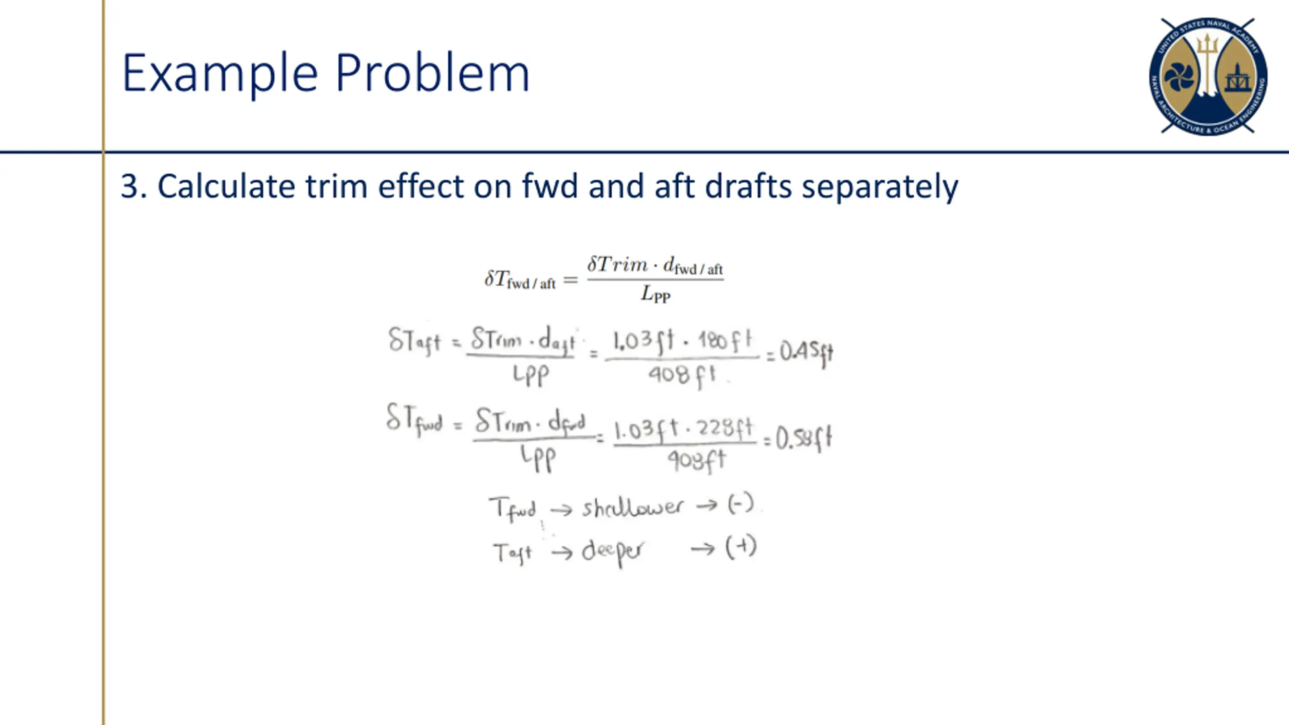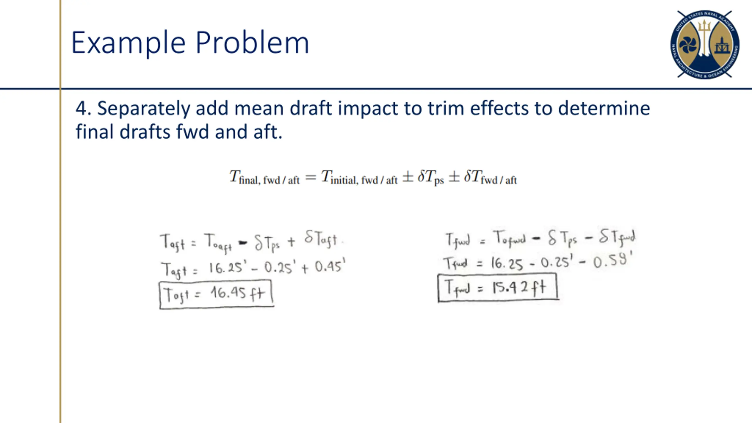 Example Problem 4. Separately add mean draft impact to trim effects to determine final drafts fwd and aft.
