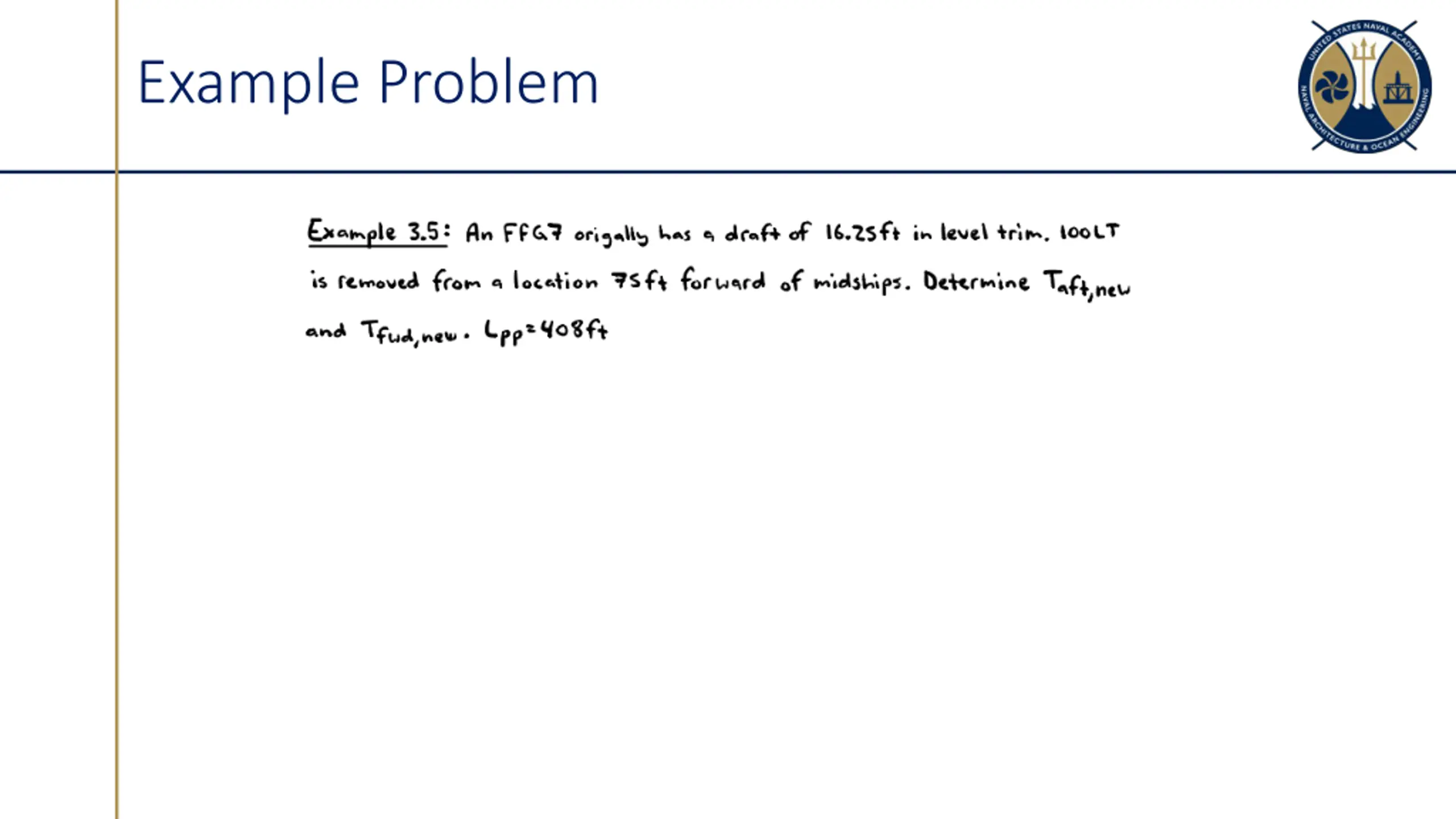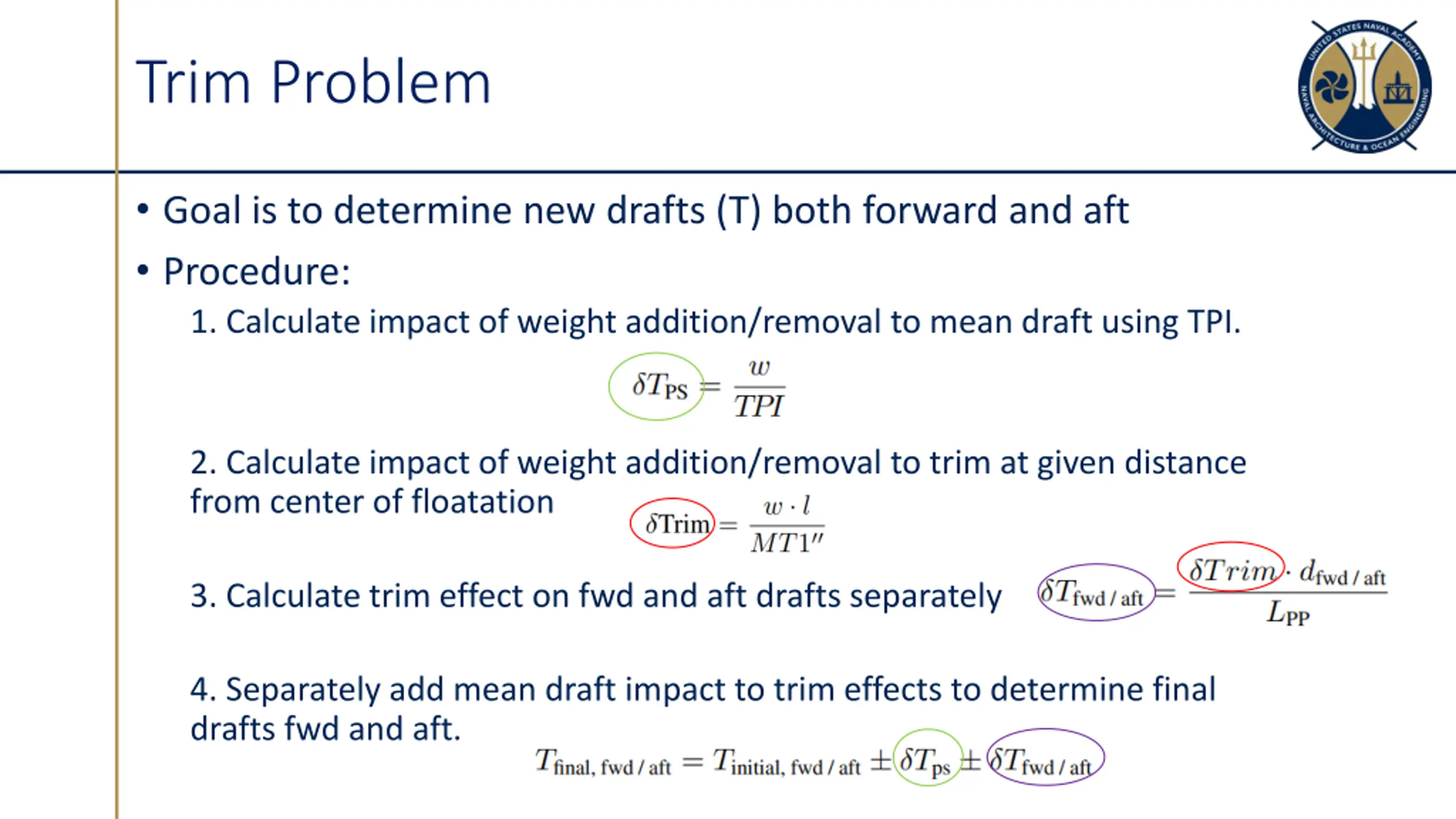 Trim Problem Goal is to determine new drafts (T) both forward and aft Procedure: 1. Calculate impact of weight addition/removal to mean draft using TPI. 2. Calculate impact of weight addition/removal to trim at given distance from center of floatation 3. Calculate trim effect on fwd and aft drafts separately 4. Separately add mean draft impact to trim effects to determine final drafts fwd and aft.