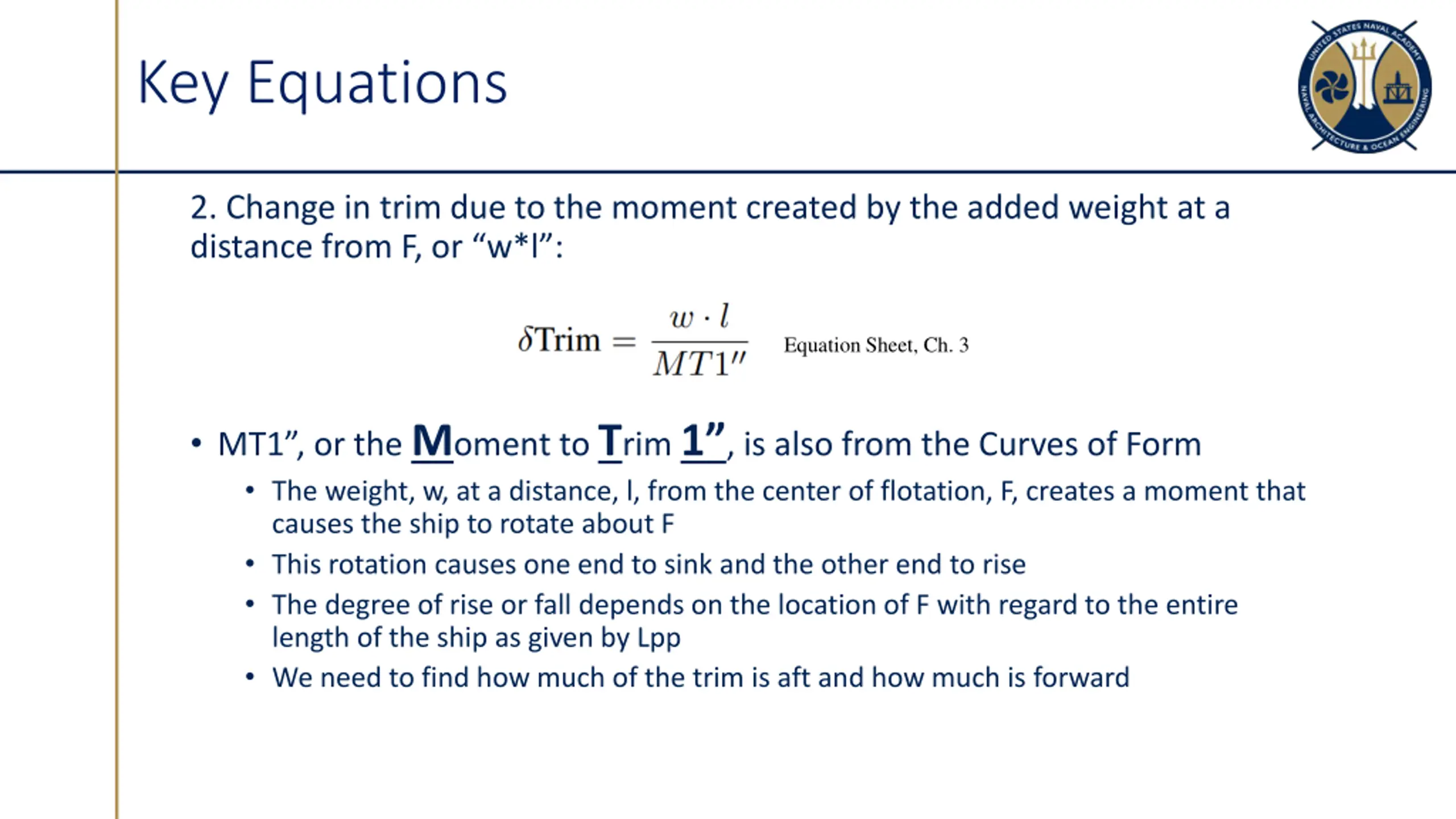 Key Equations 2. Change in trim due to the moment created by the added weight at a distance from F, or w*l : Equation Sheet, Ch. 3 MT1 , or the Moment to Trim 1 , is also from the Curves of Form The weight, w, at a distance, l, from the center of flotation, F, creates a moment that causes the ship to rotate about F This rotation causes one end to sink and the other end to rise The degree of rise or fall depends on the location of F with regard to the entire length of the ship as given by Lpp We need to find how much of the trim is aft and how much is forward