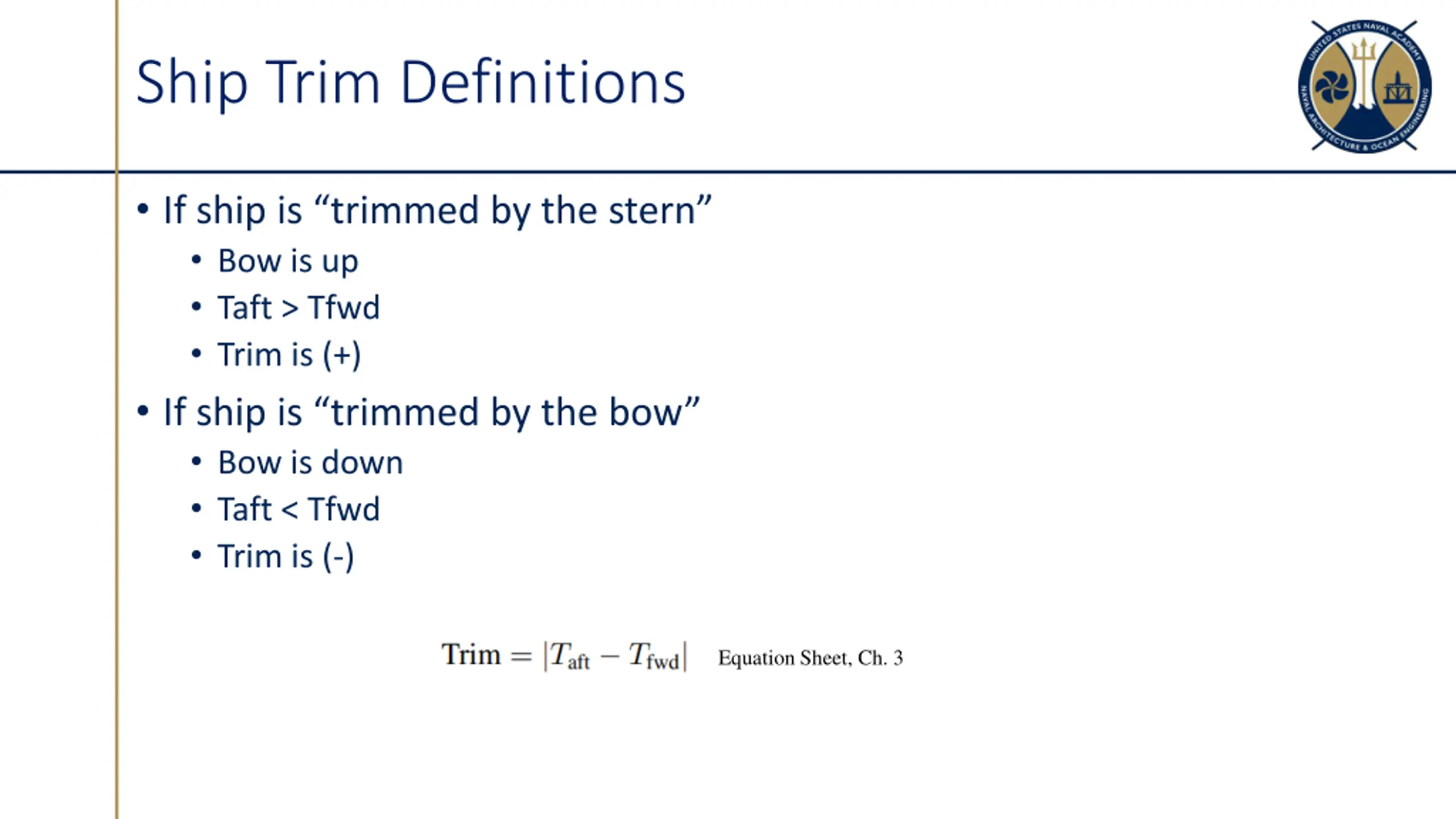 Ship Trim Definitions If ship is trimmed by the stern Bow is up Taft > Tfwd Trim is (+) If ship is trimmed by the bow Bow is down Taft < Tfwd Trim is (-) Equation Sheet, Ch. 3