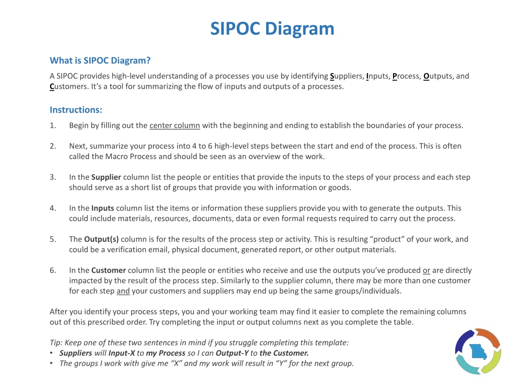 SIPOC Diagram What is SIPOC Diagram? A SIPOC provides high-level understanding of a processes you use by identifying Suppliers, Inputs, Process, Outputs, and Customers. It s a tool for summarizing the flow of inputs and outputs of a processes. Instructions: 1. Begin by filling out the center column with the beginning and ending to establish the boundaries of your process. 2. Next, summarize your process into 4 to 6 high-level steps between the start and end of the process. This is often called the Macro Process and should be seen as an overview of the work. 3. In the Supplier column list the people or entities that provide the inputs to the steps of your process and each step should serve as a short list of groups that provide you with information or goods. 4. In the Inputs column list the items or information these suppliers provide you with to generate the outputs. This could include materials, resources, documents, data or even formal requests required to carry out the process. 5. The Output(s) column is for the results of the process step or activity. This is resulting product of your work, and could be a verification email, physical document, generated report, or other output materials. 6. In the Customer column list the people or entities who receive and use the outputs you ve produced or are directly impacted by the result of the process step. Similarly to the supplier column, there may be more than one customer for each step and your customers and suppliers may end up being the same groups/individuals. After you identify your process steps, you and your working team may find it easier to complete the remaining columns out of this prescribed order. Try completing the input or output columns next as you complete the table. Tip: Keep one of these two sentences in mind if you struggle completing this template: Suppliers will Input-X to my Process so I can Output-Y to the Customer. The groups I work with give me X and my work will result in Y for the next group.