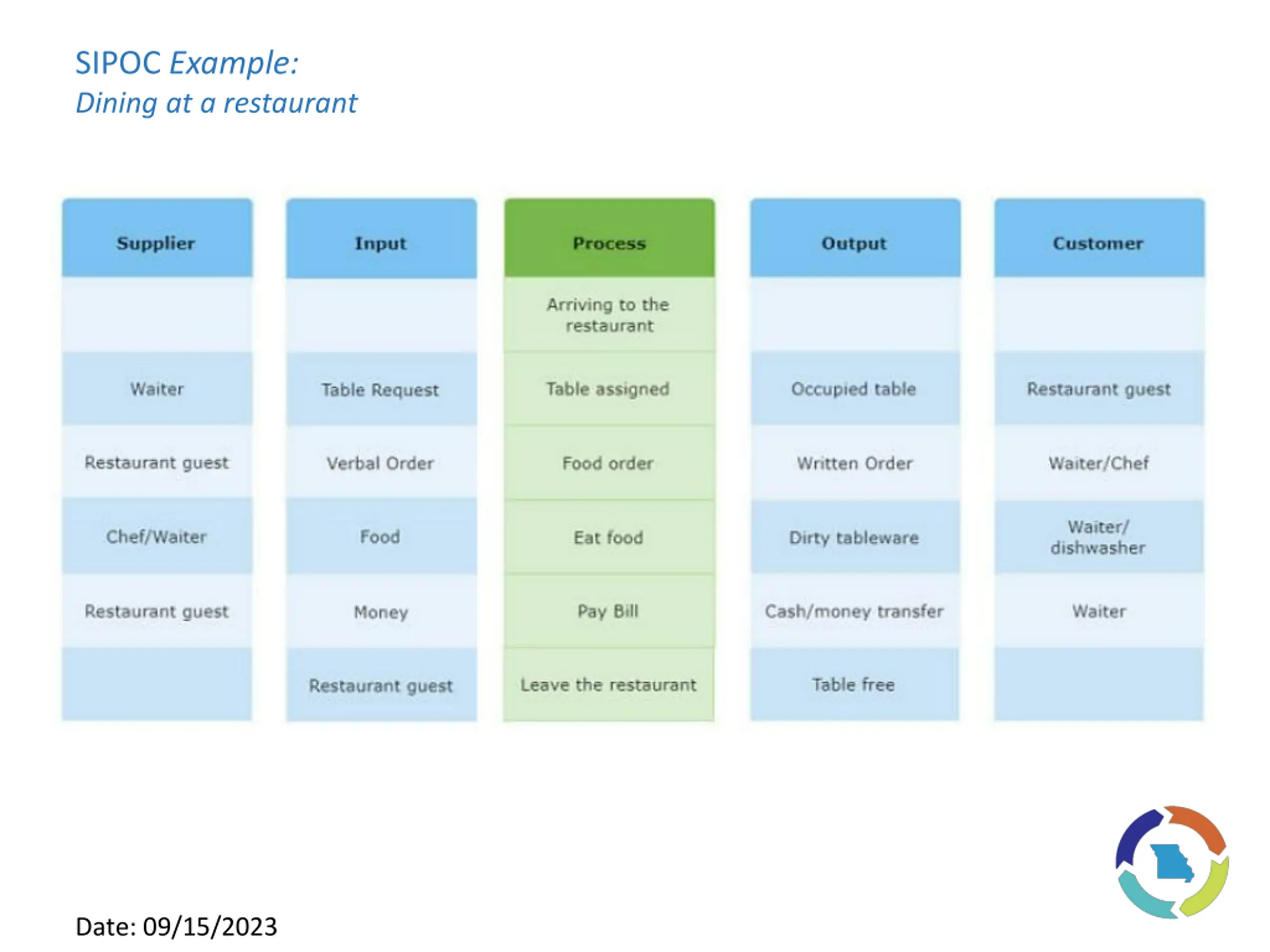 SIPOC Example: Dining at a restaurant Date: 09/15/2023