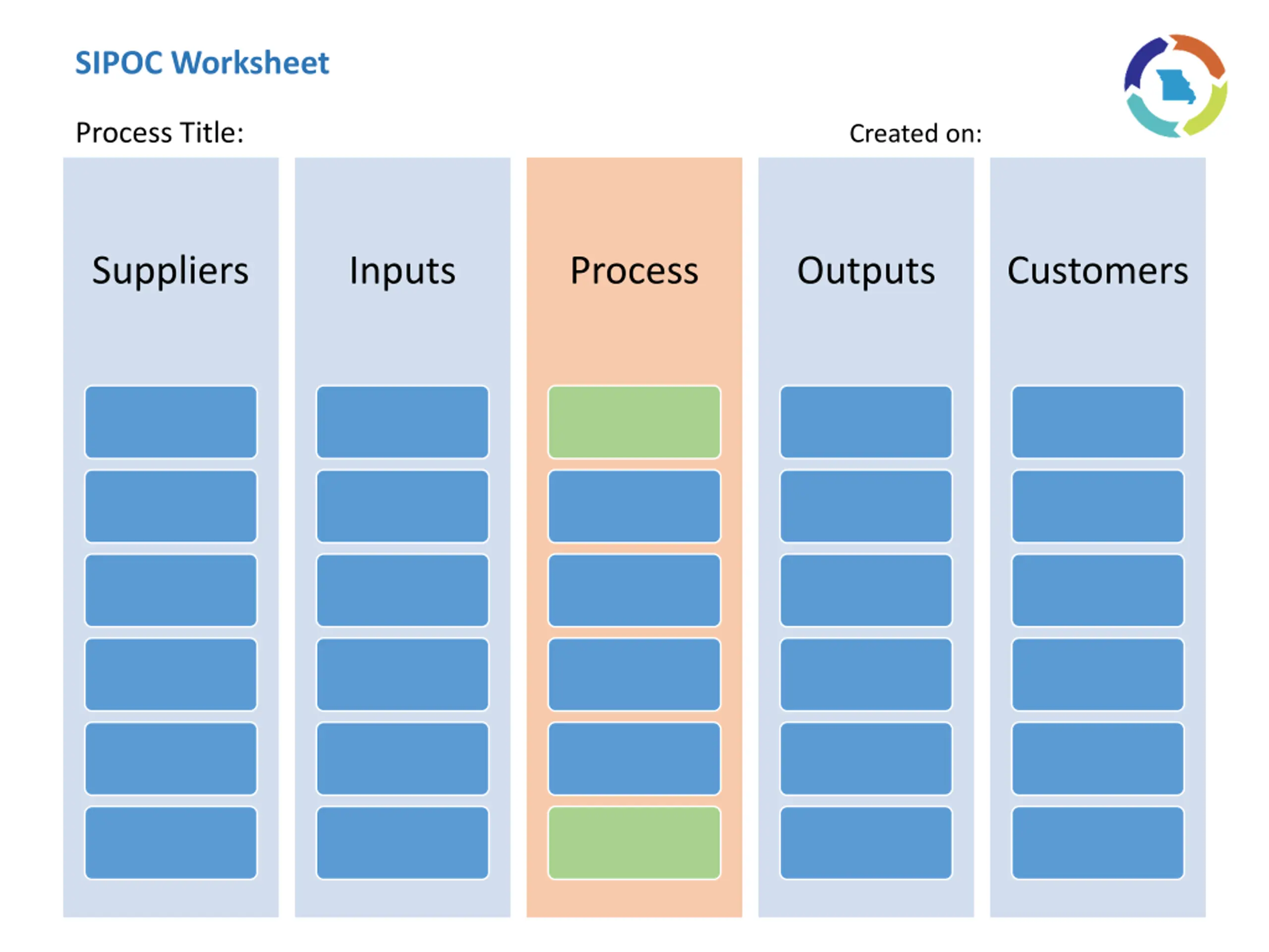 SIPOC Worksheet Process Title: Created on: Suppliers Inputs Process Outputs Customers