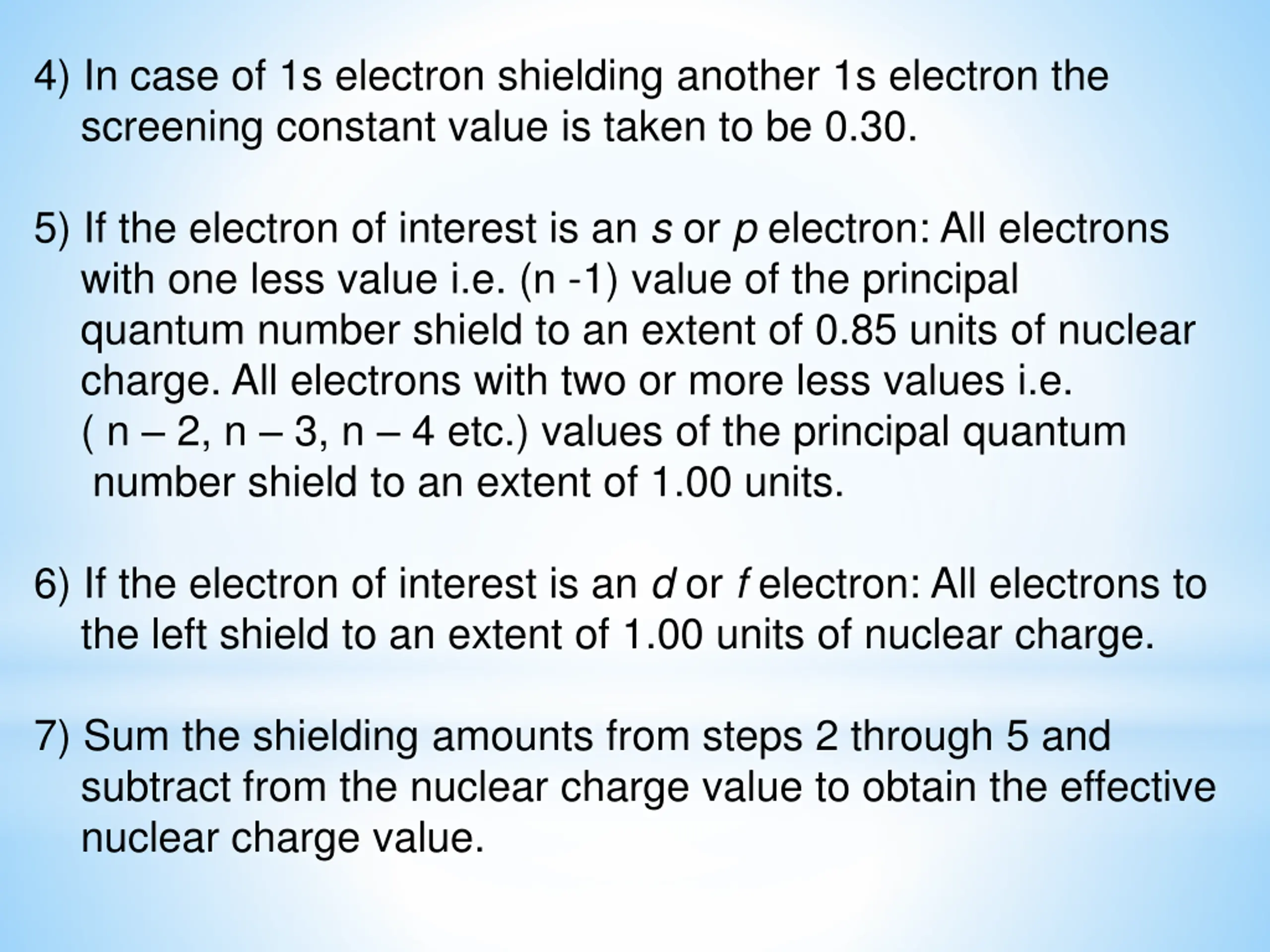 4) In case of 1s electron shielding another 1s electron the screening constant value is taken to be 0.30. 5) If the electron of interest is an s or p electron: All electrons with one less value i.e. (n -1) value of the principal quantum number shield to an extent of 0.85 units of nuclear charge. All electrons with two or more less values i.e. ( n 2, n 3, n 4 etc.) values of the principal quantum number shield to an extent of 1.00 units. 6) If the electron of interest is an d or f electron: All electrons to the left shield to an extent of 1.00 units of nuclear charge. 7) Sum the shielding amounts from steps 2 through 5 and subtract from the nuclear charge value to obtain the effective nuclear charge value.