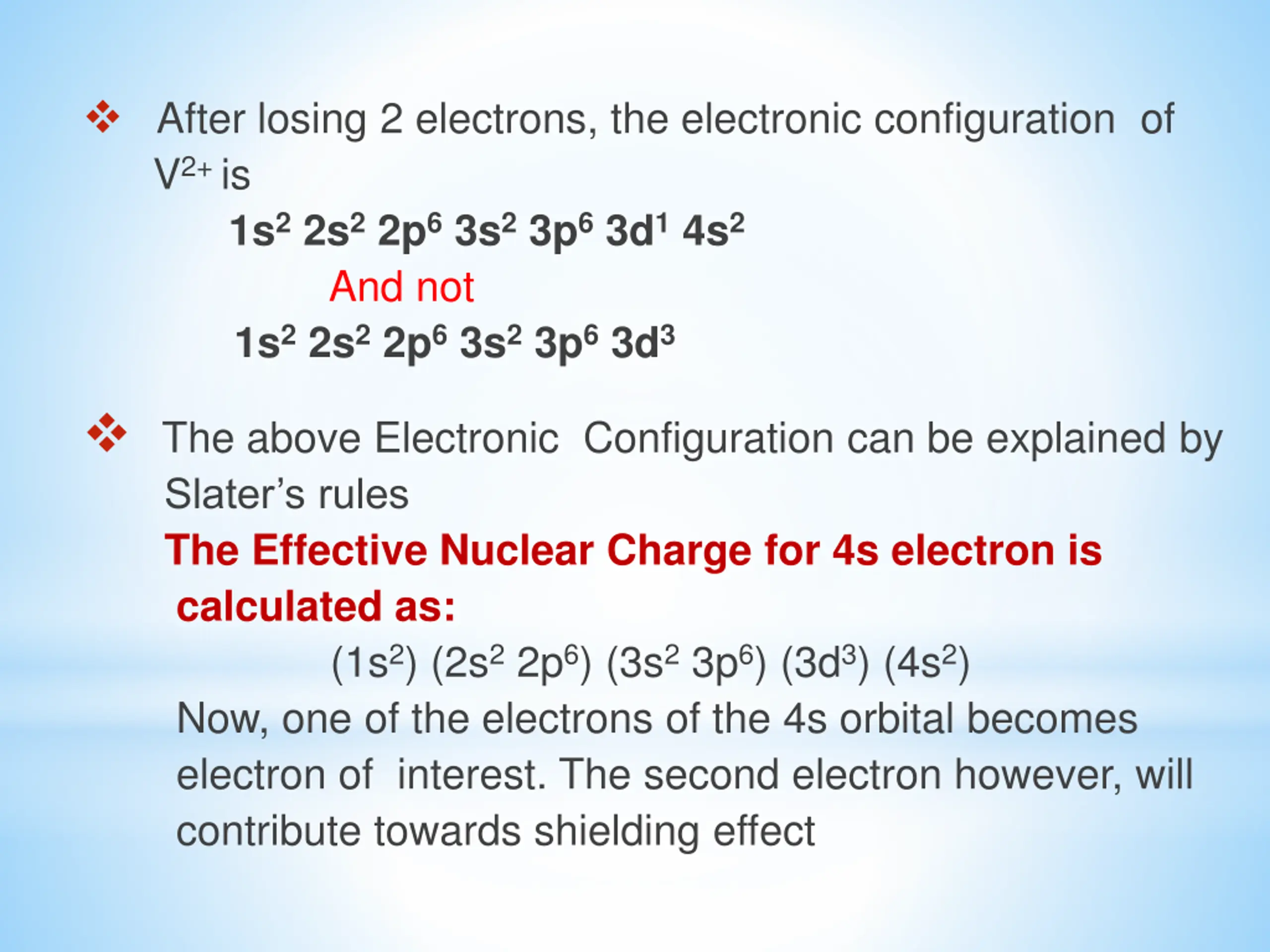 After losing 2 electrons, the electronic configuration of V2+ is 1s2 2s2 2p6 3s2 3p6 3d1 4s2 And not 1s2 2s2 2p6 3s2 3p6 3d3 The above Electronic Configuration can be explained by Slater s rules The Effective Nuclear Charge for 4s electron is calculated as: (1s2) (2s2 2p6) (3s2 3p6) (3d3) (4s2) Now, one of the electrons of the 4s orbital becomes electron of interest. The second electron however, will contribute towards shielding effect