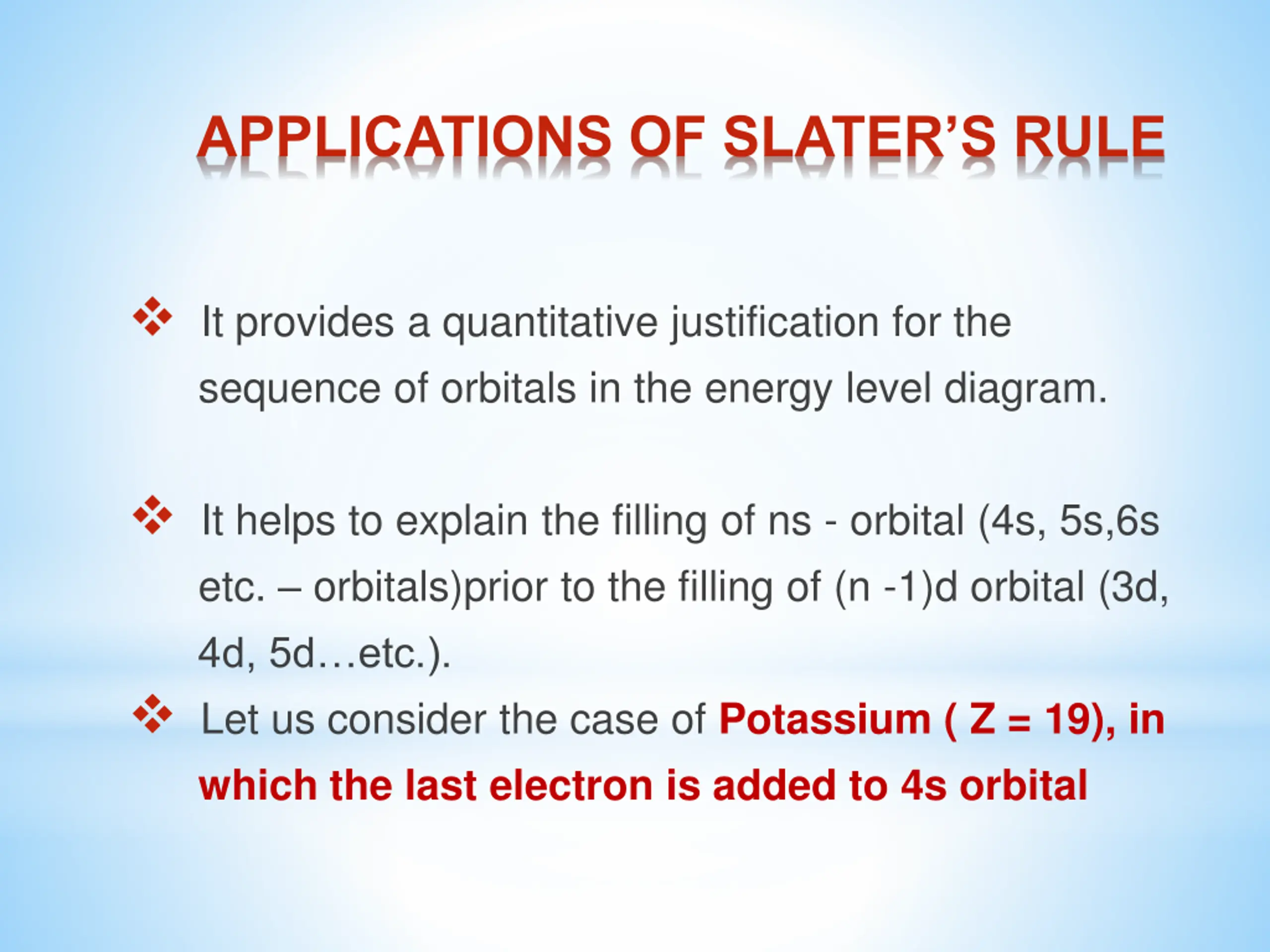 APPLICATIONS OF SLATERS RULE It provides a quantitative justification for the sequence of orbitals in the energy level diagram. It helps to explain the filling of ns - orbital (4s, 5s,6s etc. orbitals)prior to the filling of (n -1)d orbital (3d, 4d, 5d etc.). Let us consider the case of Potassium ( Z = 19), in which the last electron is added to 4s orbital