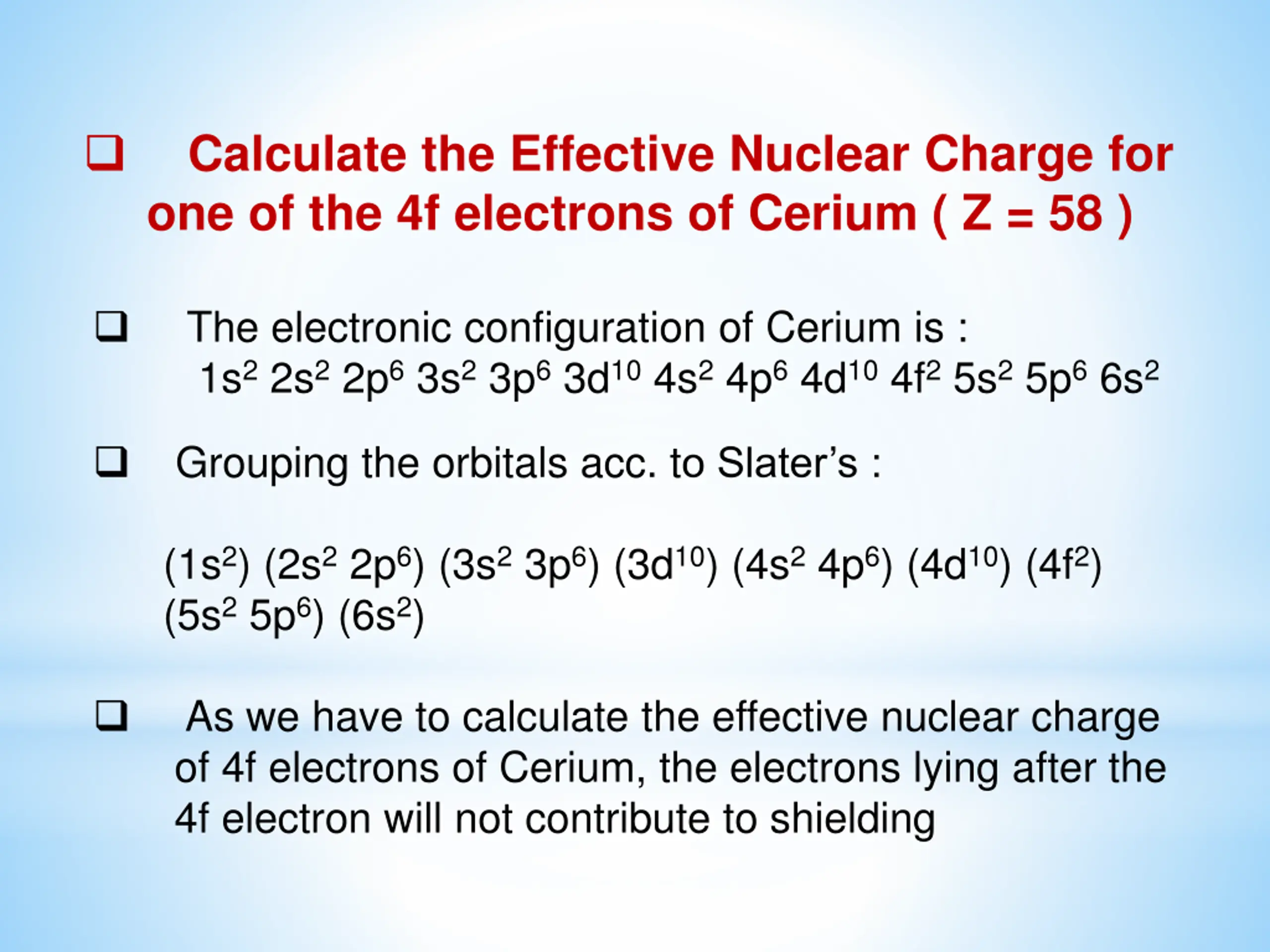 Calculate the Effective Nuclear Charge for one of the 4f electrons of Cerium ( Z = 58 ) The electronic configuration of Cerium is : 1s2 2s2 2p6 3s2 3p6 3d10 4s2 4p6 4d10 4f2 5s2 5p6 6s2 Grouping the orbitals acc. to Slater s : (1s2) (2s2 2p6) (3s2 3p6) (3d10) (4s2 4p6) (4d10) (4f2) (5s2 5p6) (6s2) As we have to calculate the effective nuclear charge of 4f electrons of Cerium, the electrons lying after the 4f electron will not contribute to shielding