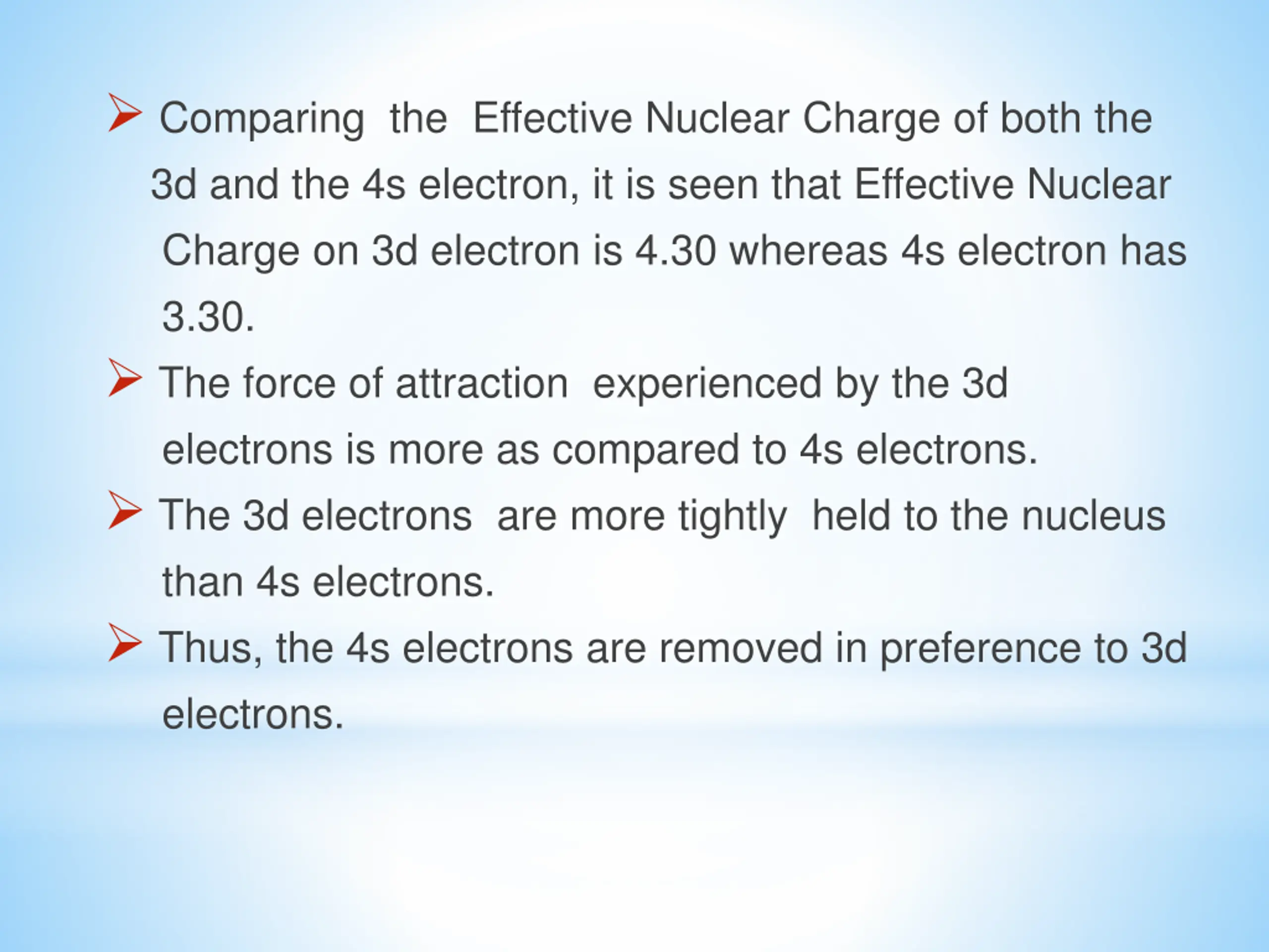 Comparing the Effective Nuclear Charge of both the 3d and the 4s electron, it is seen that Effective Nuclear Charge on 3d electron is 4.30 whereas 4s electron has 3.30. The force of attraction experienced by the 3d electrons is more as compared to 4s electrons. The 3d electrons are more tightly held to the nucleus than 4s electrons. Thus, the 4s electrons are removed in preference to 3d electrons.