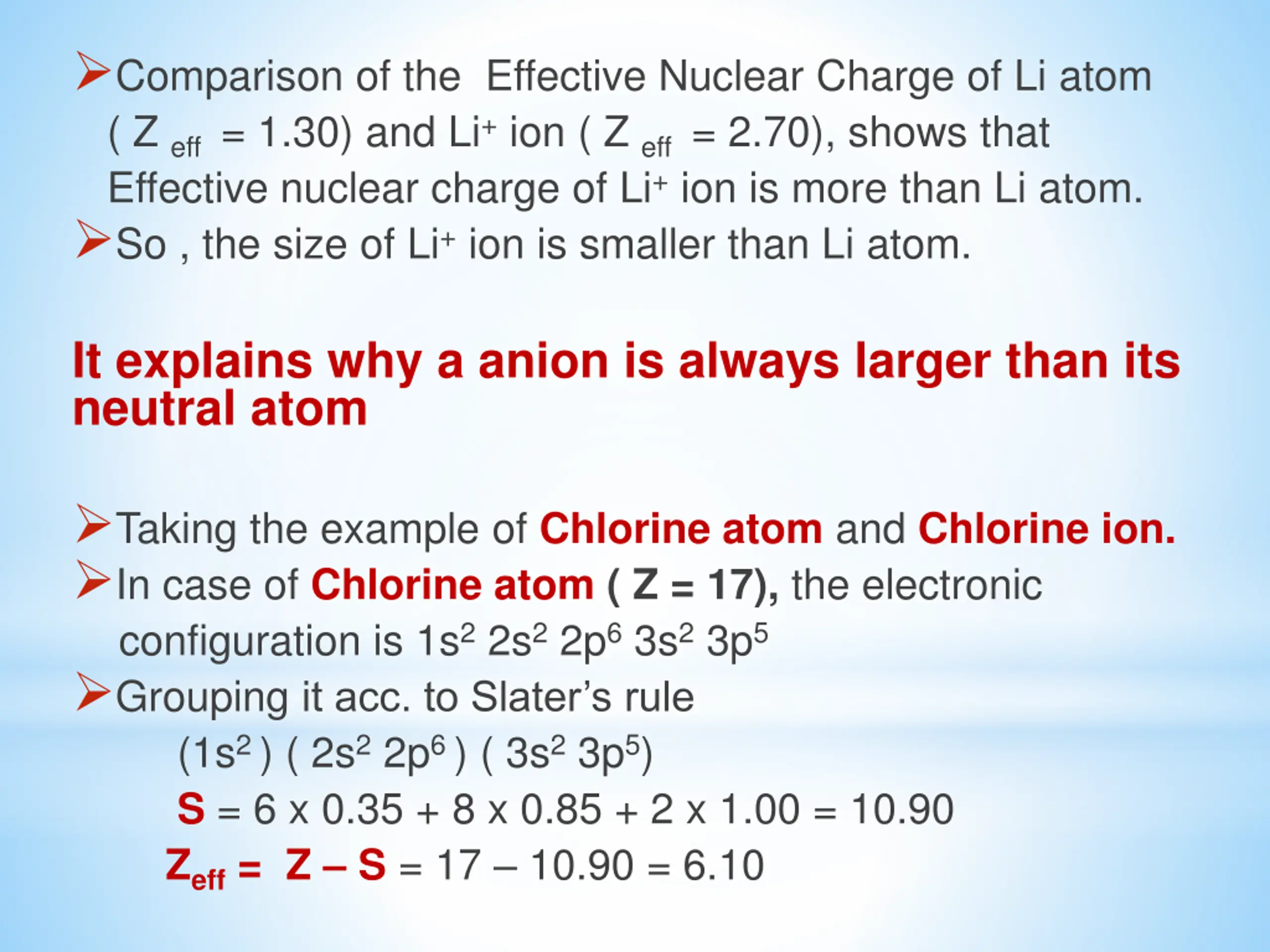 Comparison of the Effective Nuclear Charge of Li atom ( Z eff = 1.30) and Li+ ion ( Z eff = 2.70), shows that Effective nuclear charge of Li+ ion is more than Li atom. So , the size of Li+ ion is smaller than Li atom. It explains why a anion is always larger than its neutral atom Taking the example of Chlorine atom and Chlorine ion. In case of Chlorine atom ( Z = 17), the electronic configuration is 1s2 2s2 2p6 3s2 3p5 Grouping it acc. to Slater s rule (1s2 ) ( 2s2 2p6 ) ( 3s2 3p5) S = 6 x 0.35 + 8 x 0.85 + 2 x 1.00 = 10.90 Zeff = Z S = 17 10.90 = 6.10