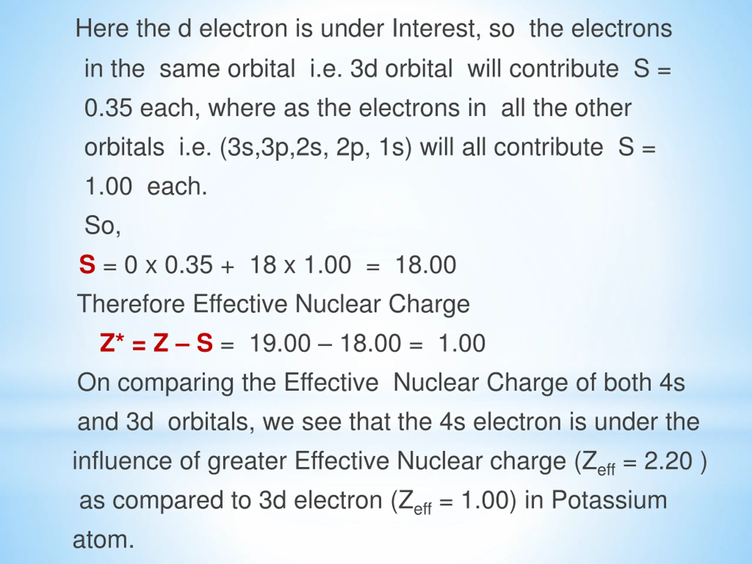 Here the d electron is under Interest, so the electrons in the same orbital i.e. 3d orbital will contribute S = 0.35 each, where as the electrons in all the other orbitals i.e. (3s,3p,2s, 2p, 1s) will all contribute S = 1.00 each. So, S = 0 x 0.35 + 18 x 1.00 = 18.00 Therefore Effective Nuclear Charge Z* = Z S = 19.00 18.00 = 1.00 On comparing the Effective Nuclear Charge of both 4s and 3d orbitals, we see that the 4s electron is under the influence of greater Effective Nuclear charge (Zeff = 2.20 ) as compared to 3d electron (Zeff = 1.00) in Potassium atom.