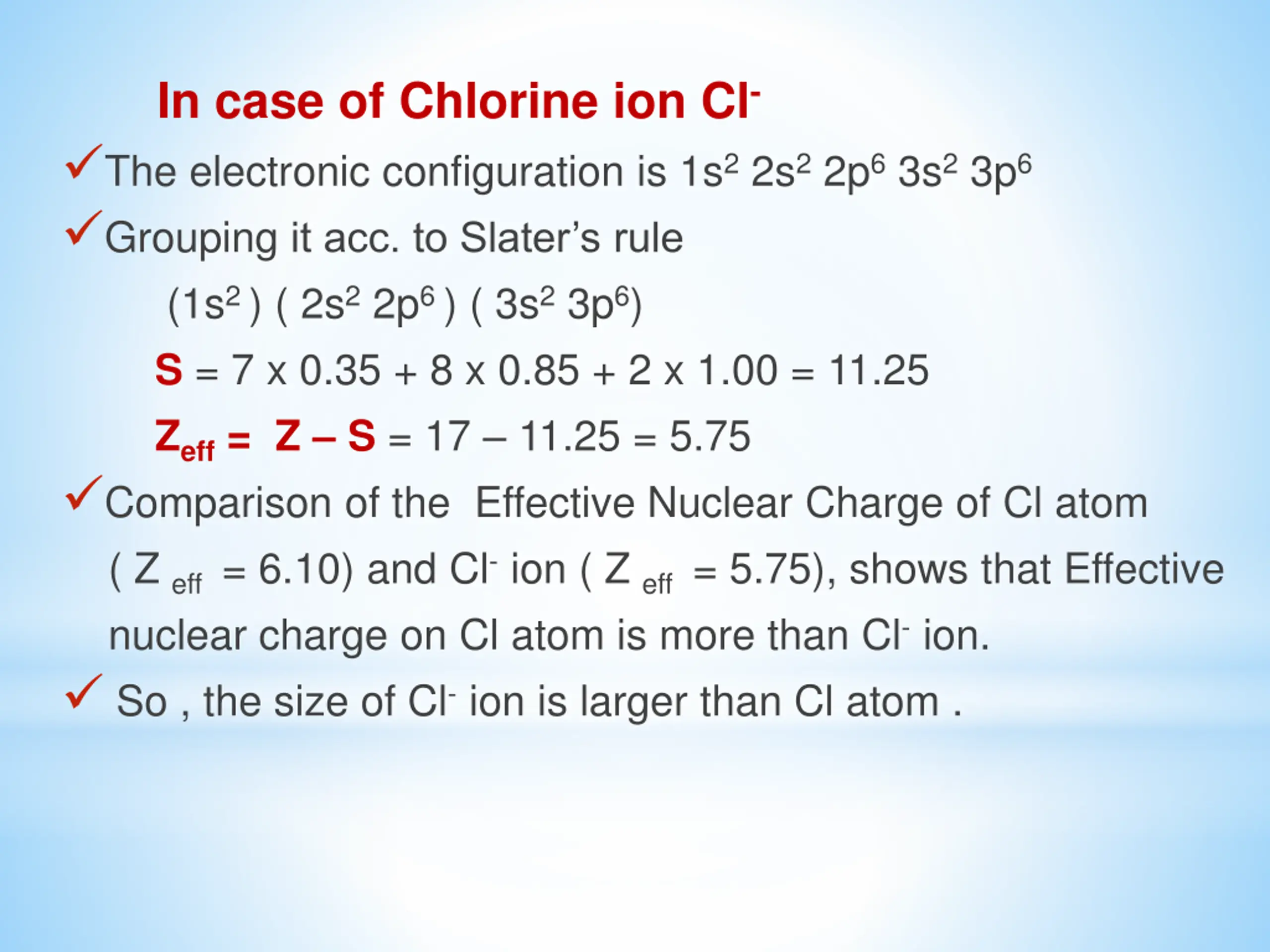 In case of Chlorine ion Cl- The electronic configuration is 1s2 2s2 2p6 3s2 3p6 Grouping it acc. to Slater s rule (1s2 ) ( 2s2 2p6 ) ( 3s2 3p6) S = 7 x 0.35 + 8 x 0.85 + 2 x 1.00 = 11.25 Zeff = Z S = 17 11.25 = 5.75 Comparison of the Effective Nuclear Charge of Cl atom ( Z eff = 6.10) and Cl- ion ( Z eff = 5.75), shows that Effective nuclear charge on Cl atom is more than Cl- ion. So , the size of Cl- ion is larger than Cl atom .