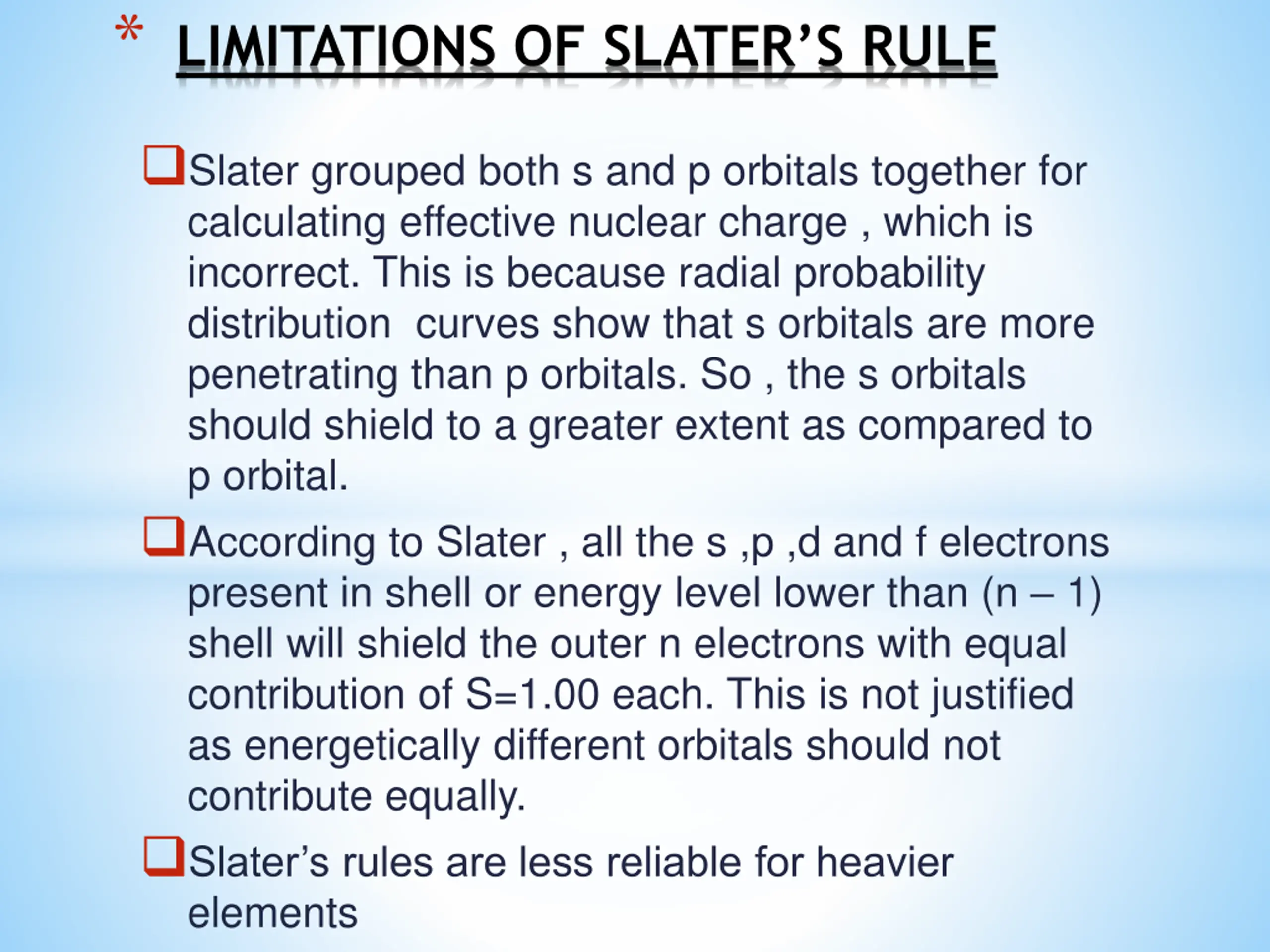 * LIMITATIONS OF SLATERS RULE Slater grouped both s and p orbitals together for calculating effective nuclear charge , which is incorrect. This is because radial probability distribution curves show that s orbitals are more penetrating than p orbitals. So , the s orbitals should shield to a greater extent as compared to p orbital. According to Slater , all the s ,p ,d and f electrons present in shell or energy level lower than (n 1) shell will shield the outer n electrons with equal contribution of S=1.00 each. This is not justified as energetically different orbitals should not contribute equally. Slater s rules are less reliable for heavier elements