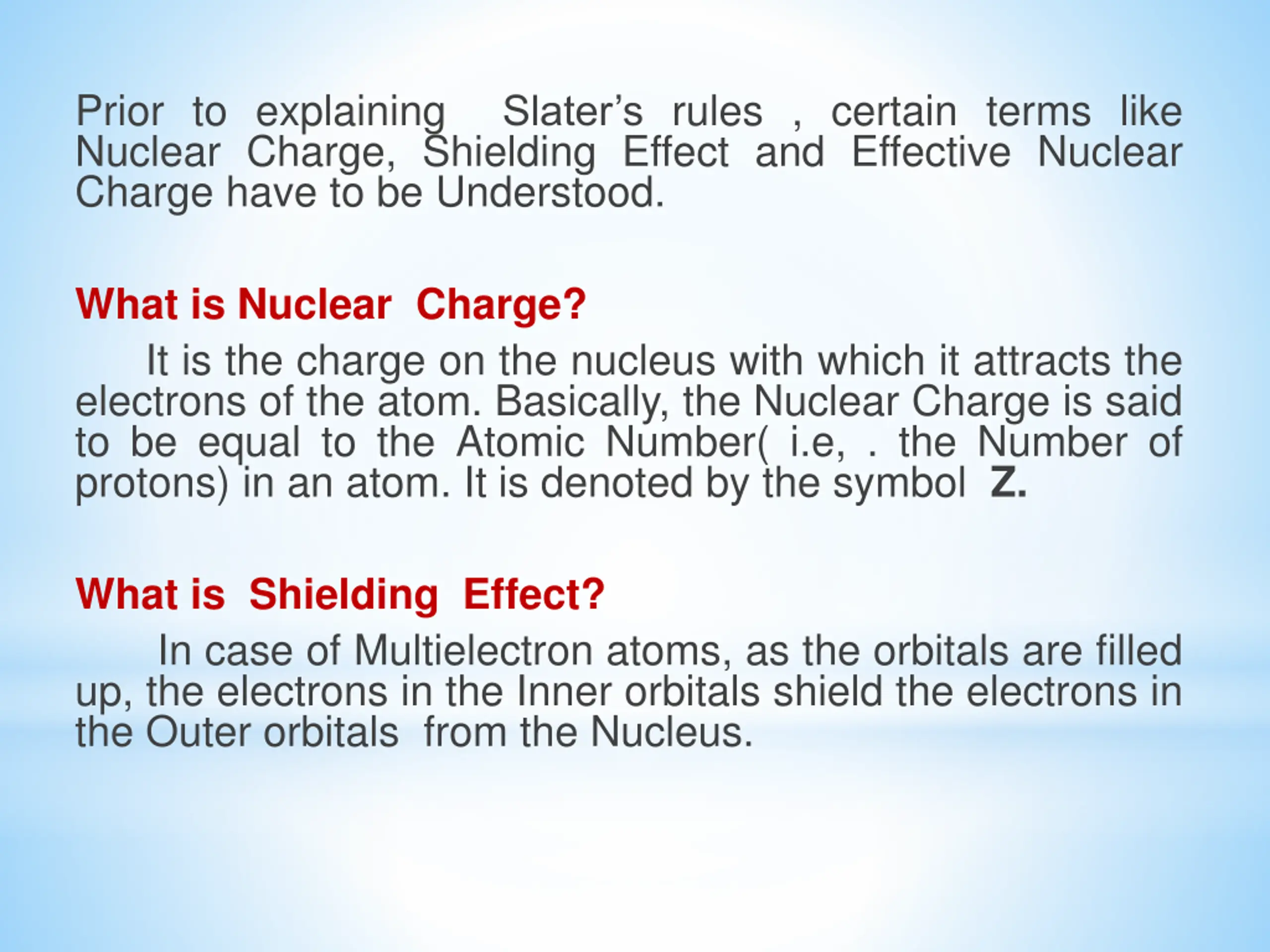 Prior to explaining Nuclear Charge, Shielding Effect and Effective Nuclear Charge have to be Understood. Slater s rules , certain terms like What is Nuclear Charge? It is the charge on the nucleus with which it attracts the electrons of the atom. Basically, the Nuclear Charge is said to be equal to the Atomic Number( i.e, . the Number of protons) in an atom. It is denoted by the symbol Z. What is Shielding Effect? In case of Multielectron atoms, as the orbitals are filled up, the electrons in the Inner orbitals shield the electrons in the Outer orbitals from the Nucleus.