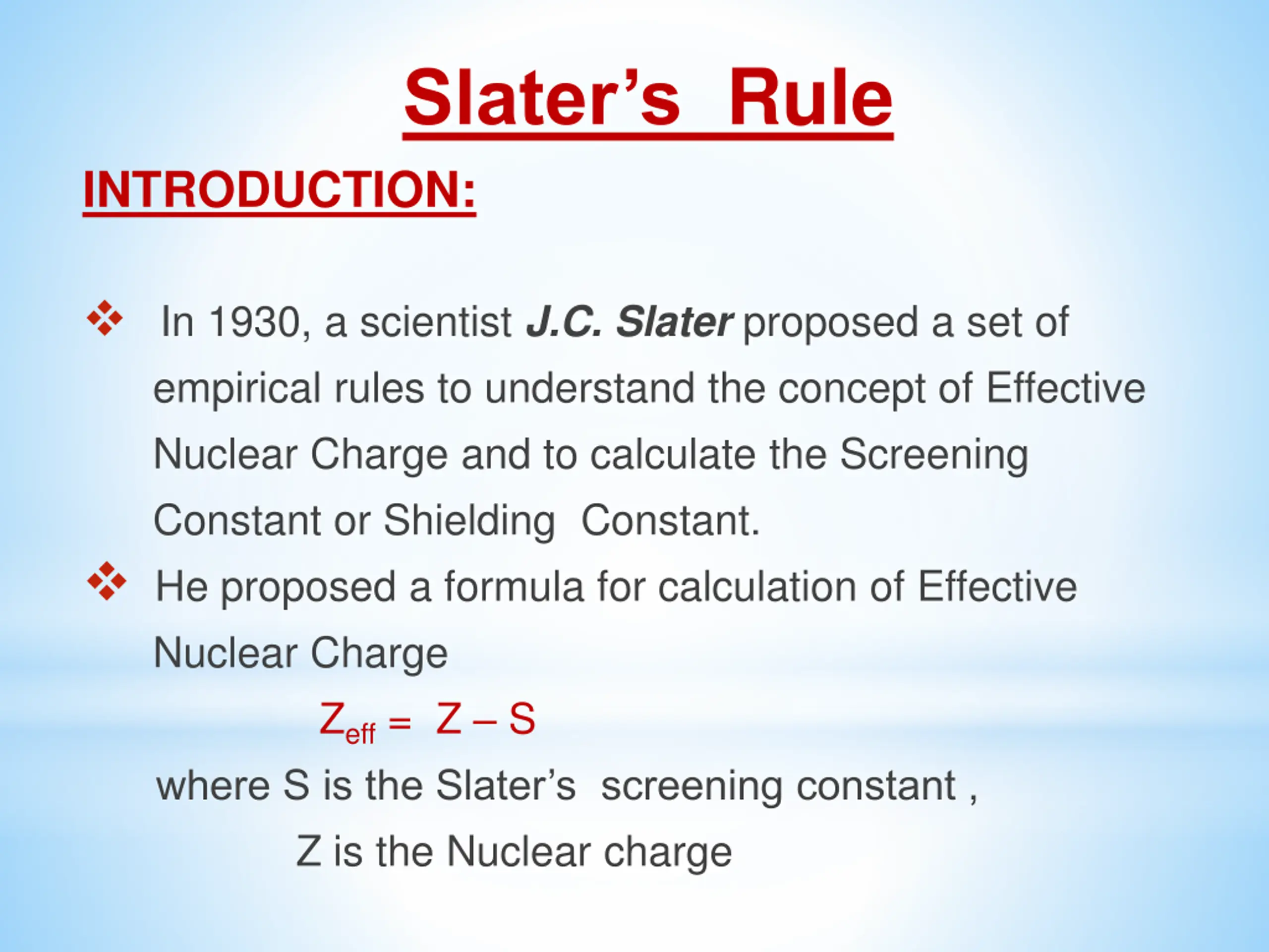 Slaters Rule INTRODUCTION: In 1930, a scientist J.C. Slater proposed a set of empirical rules to understand the concept of Effective Nuclear Charge and to calculate the Screening Constant or Shielding Constant. He proposed a formula for calculation of Effective Nuclear Charge Zeff= Z S where S is the Slater s screening constant , Z is the Nuclear charge