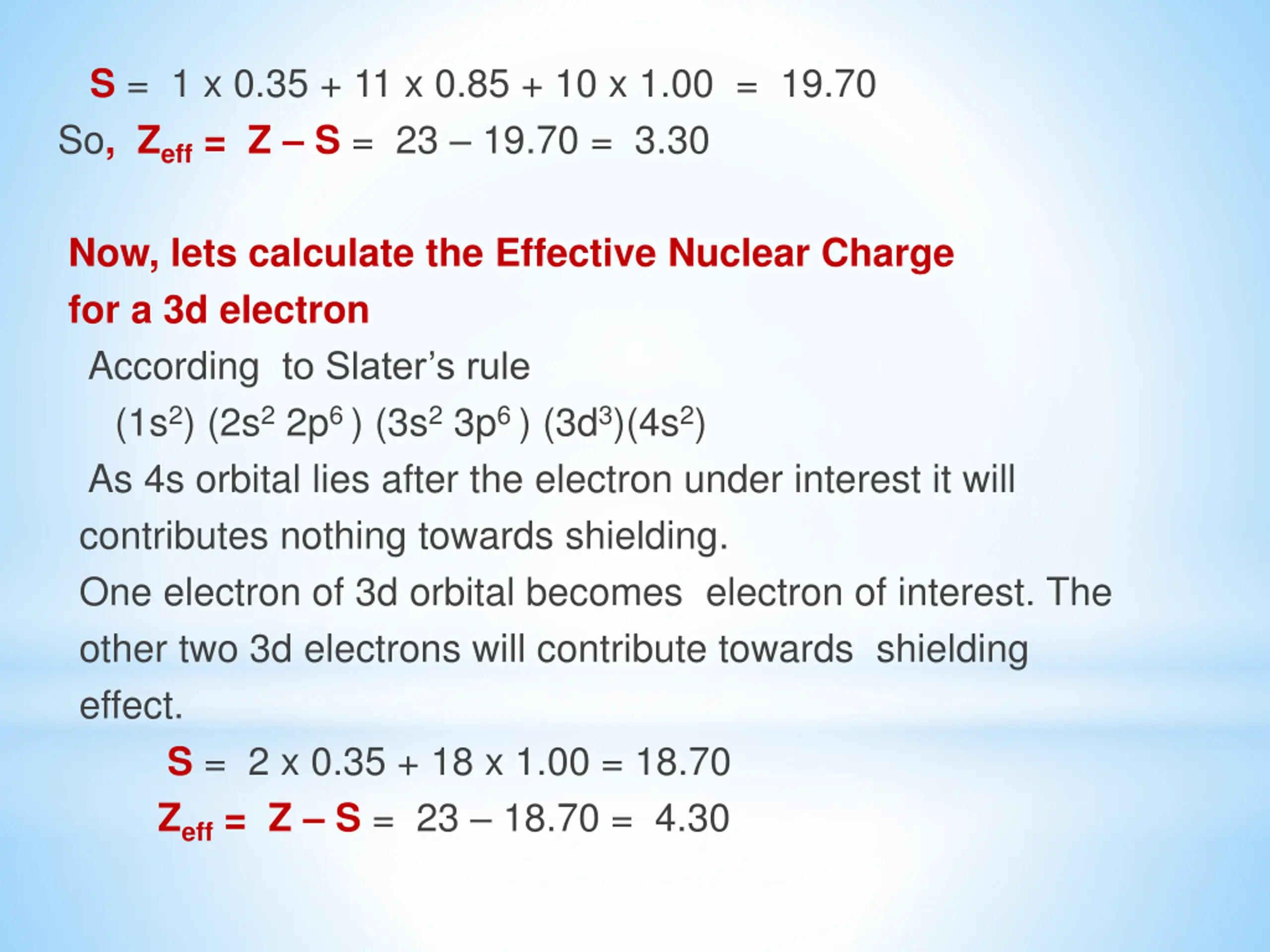 S = 1 x 0.35 + 11 x 0.85 + 10 x 1.00 = 19.70 So, Zeff = Z S = 23 19.70 = 3.30 Now, lets calculate the Effective Nuclear Charge for a 3d electron According to Slater s rule (1s2) (2s2 2p6 ) (3s2 3p6 ) (3d3)(4s2) As 4s orbital lies after the electron under interest it will contributes nothing towards shielding. One electron of 3d orbital becomes electron of interest. The other two 3d electrons will contribute towards shielding effect. S = 2 x 0.35 + 18 x 1.00 = 18.70 Zeff = Z S = 23 18.70 = 4.30