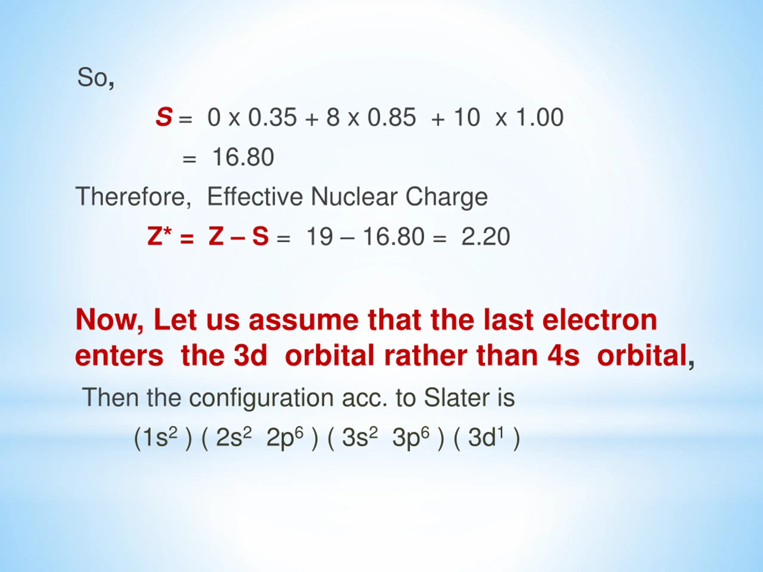 So, S = 0 x 0.35 + 8 x 0.85 + 10 x 1.00 = 16.80 Therefore, Effective Nuclear Charge Z* = Z S = 19 16.80 = 2.20 Now, Let us assume that the last electron enters the 3d orbital rather than 4s orbital, Then the configuration acc. to Slater is (1s2 ) ( 2s2 2p6 ) ( 3s2 3p6 ) ( 3d1 )