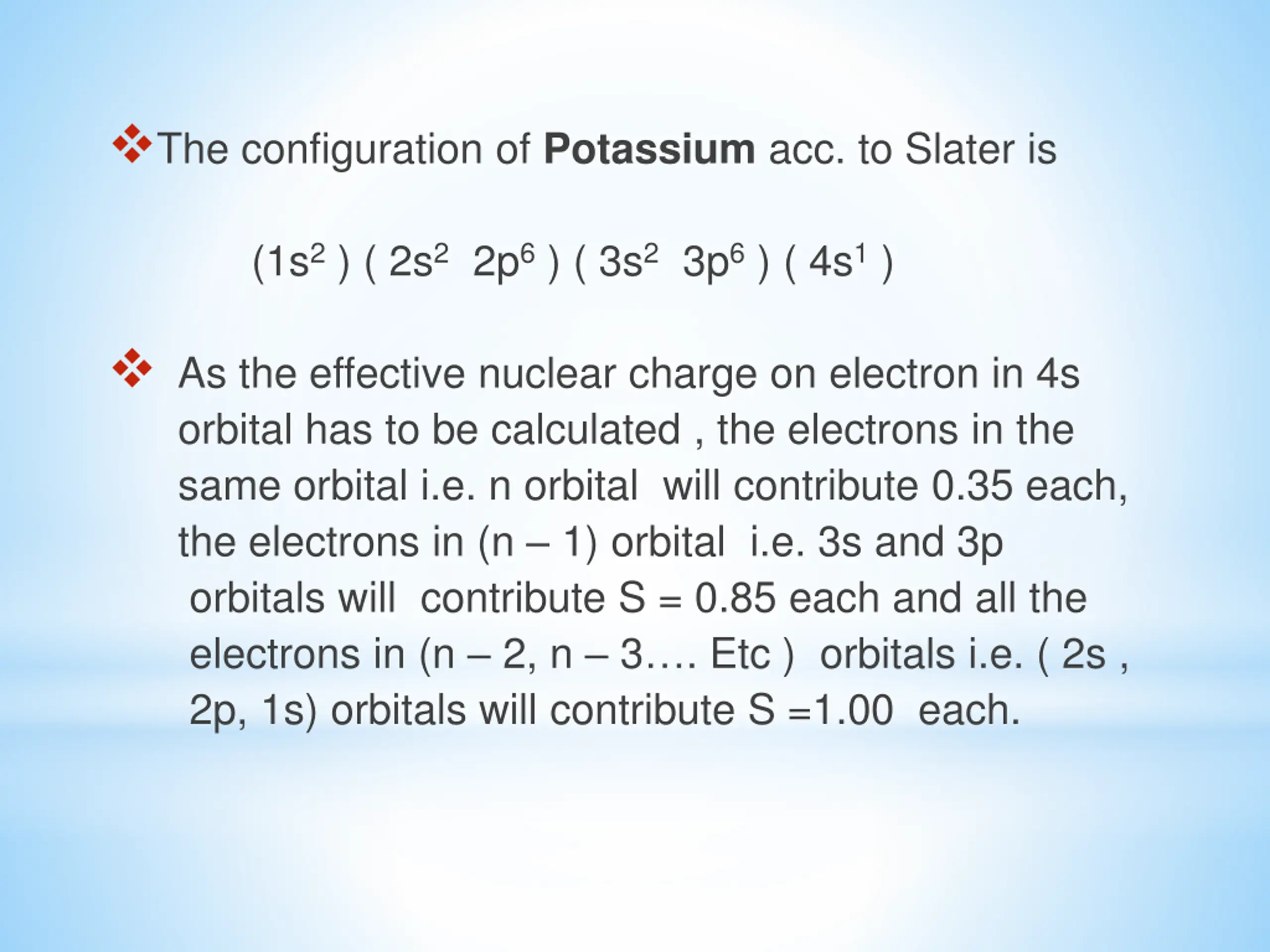The configuration of Potassium acc. to Slater is (1s2 ) ( 2s2 2p6 ) ( 3s2 3p6 ) ( 4s1 ) As the effective nuclear charge on electron in 4s orbital has to be calculated , the electrons in the same orbital i.e. n orbital will contribute 0.35 each, the electrons in (n 1) orbital i.e. 3s and 3p orbitals will contribute S = 0.85 each and all the electrons in (n 2, n 3 . Etc ) orbitals i.e. ( 2s , 2p, 1s) orbitals will contribute S =1.00 each.