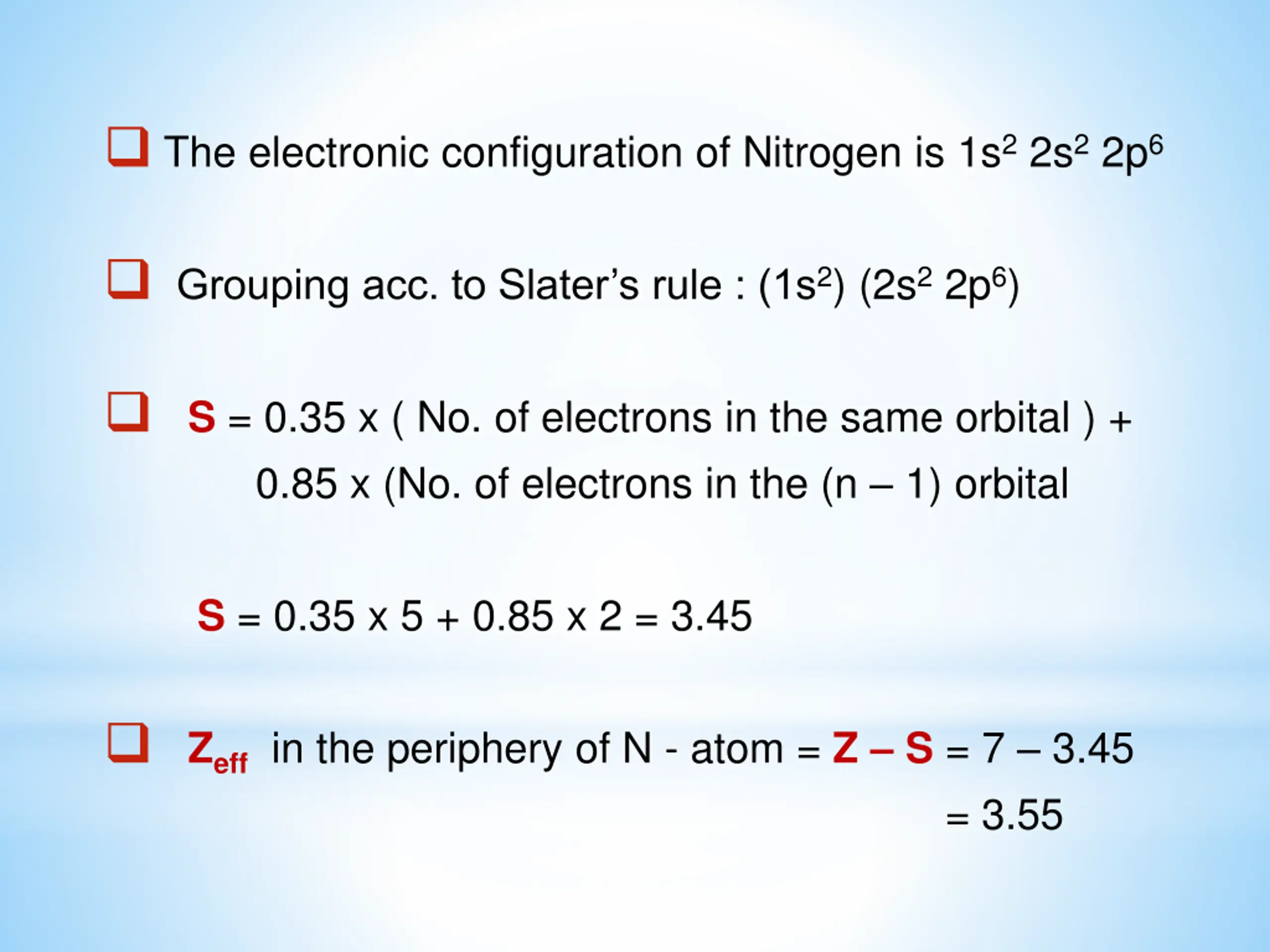 The electronic configuration of Nitrogen is 1s2 2s2 2p6 Grouping acc. to Slater s rule : (1s2) (2s2 2p6) S = 0.35 x ( No. of electrons in the same orbital ) + 0.85 x (No. of electrons in the (n 1) orbital S = 0.35 x 5 + 0.85 x 2 = 3.45 Zeffin the periphery of N - atom = Z S = 7 3.45 = 3.55