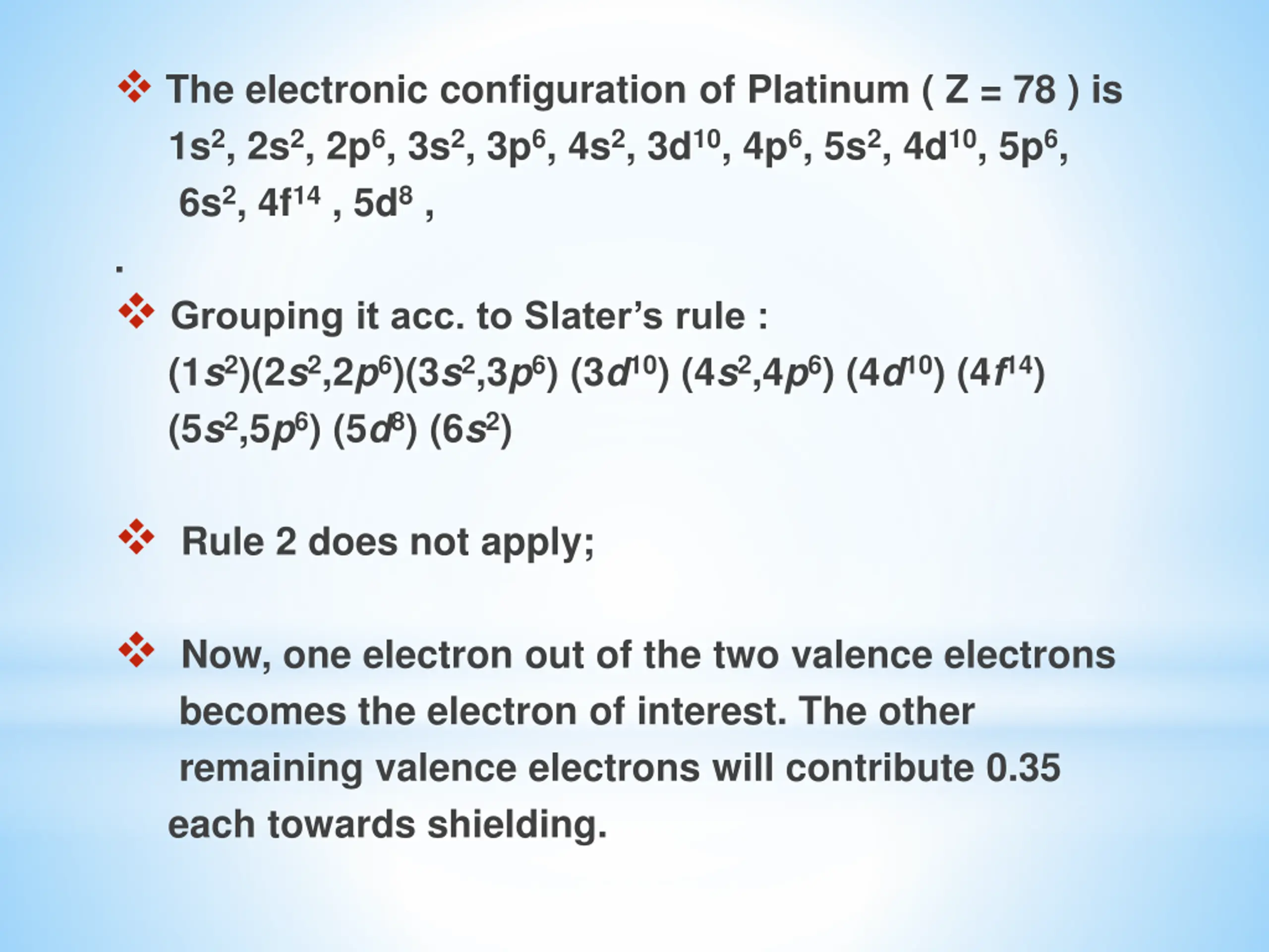 The electronic configuration of Platinum ( Z = 78 ) is 1s2, 2s2, 2p6, 3s2, 3p6, 4s2, 3d10, 4p6, 5s2, 4d10, 5p6, 6s2, 4f14 , 5d8 , . Grouping it acc. to Slater s rule : (1s2)(2s2,2p6)(3s2,3p6) (3d10) (4s2,4p6) (4d10) (4f14) (5s2,5p6) (5d8) (6s2) Rule 2 does not apply; Now, one electron out of the two valence electrons becomes the electron of interest. The other remaining valence electrons will contribute 0.35 each towards shielding.
