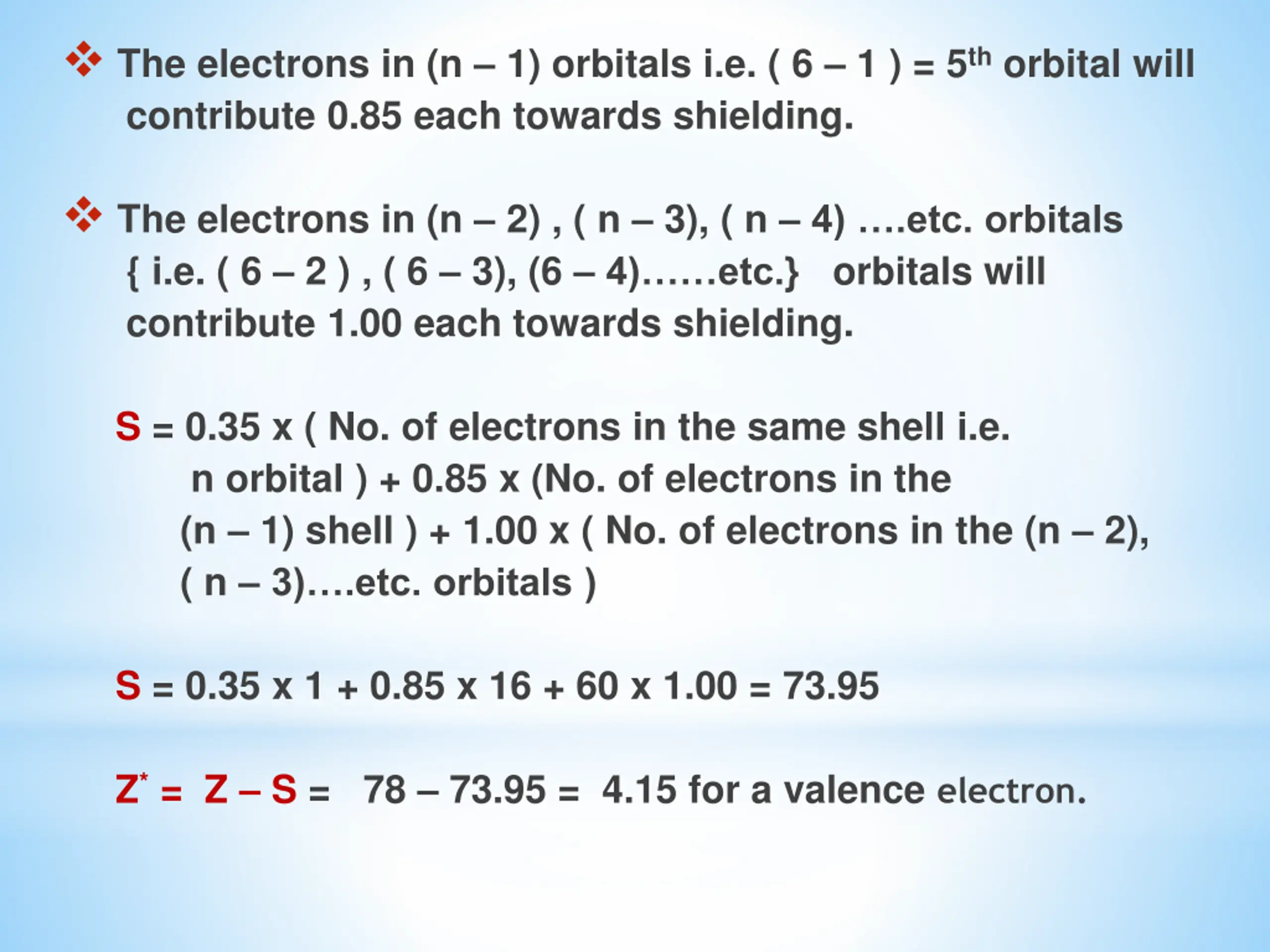The electrons in (n 1) orbitals i.e. ( 6 1 ) = 5th orbital will contribute 0.85 each towards shielding. The electrons in (n 2) , ( n 3), ( n 4) .etc. orbitals { i.e. ( 6 2 ) , ( 6 3), (6 4) etc.} orbitals will contribute 1.00 each towards shielding. S = 0.35 x ( No. of electrons in the same shell i.e. n orbital ) + 0.85 x (No. of electrons in the (n 1) shell ) + 1.00 x ( No. of electrons in the (n 2), ( n 3) .etc. orbitals ) S = 0.35 x 1 + 0.85 x 16 + 60 x 1.00 = 73.95 Z*= Z S = 78 73.95 = 4.15 for a valence electron.