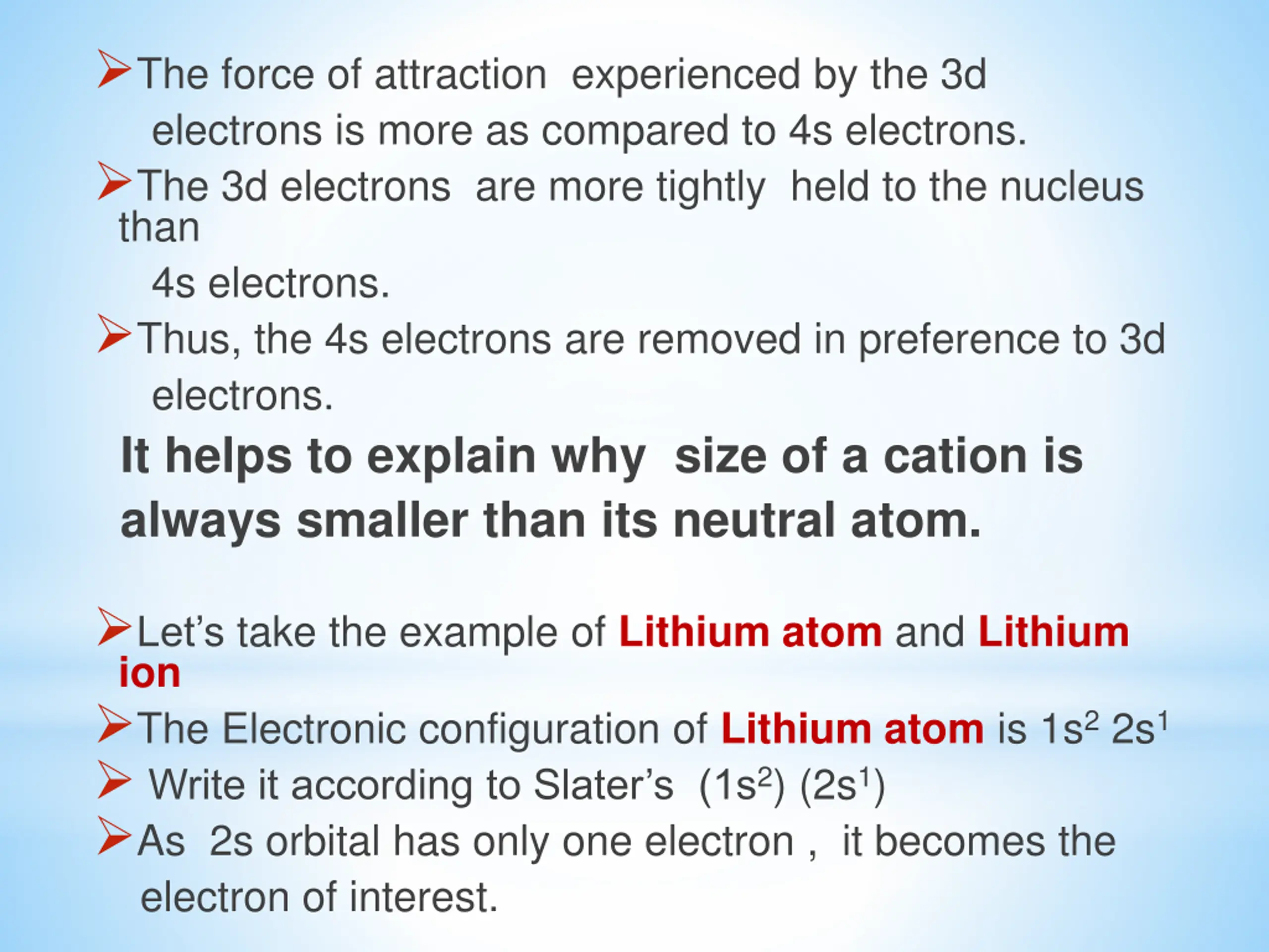 The force of attraction experienced by the 3d electrons is more as compared to 4s electrons. The 3d electrons are more tightly held to the nucleus than 4s electrons. Thus, the 4s electrons are removed in preference to 3d electrons. It helps to explain why size of a cation is always smaller than its neutral atom. Let s take the example of Lithium atom and Lithium ion The Electronic configuration of Lithium atom is 1s2 2s1 Write it according to Slater s (1s2) (2s1) As 2s orbital has only one electron , it becomes the electron of interest.