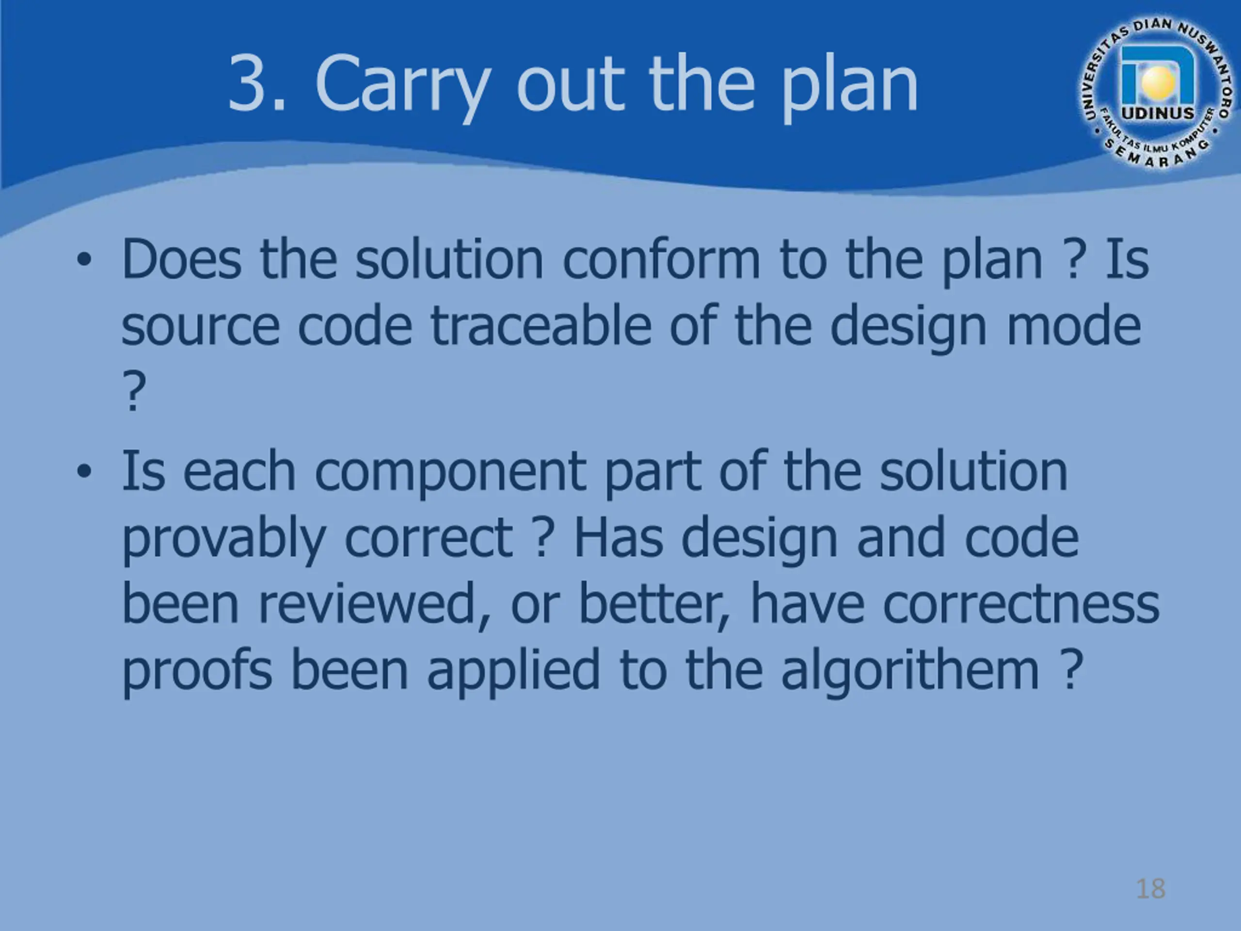 3. Carry out the plan Does the solution conform to the plan ? Is source code traceable of the design mode ? Is each component part of the solution provably correct ? Has design and code been reviewed, or better, have correctness proofs been applied to the algorithem ? 18