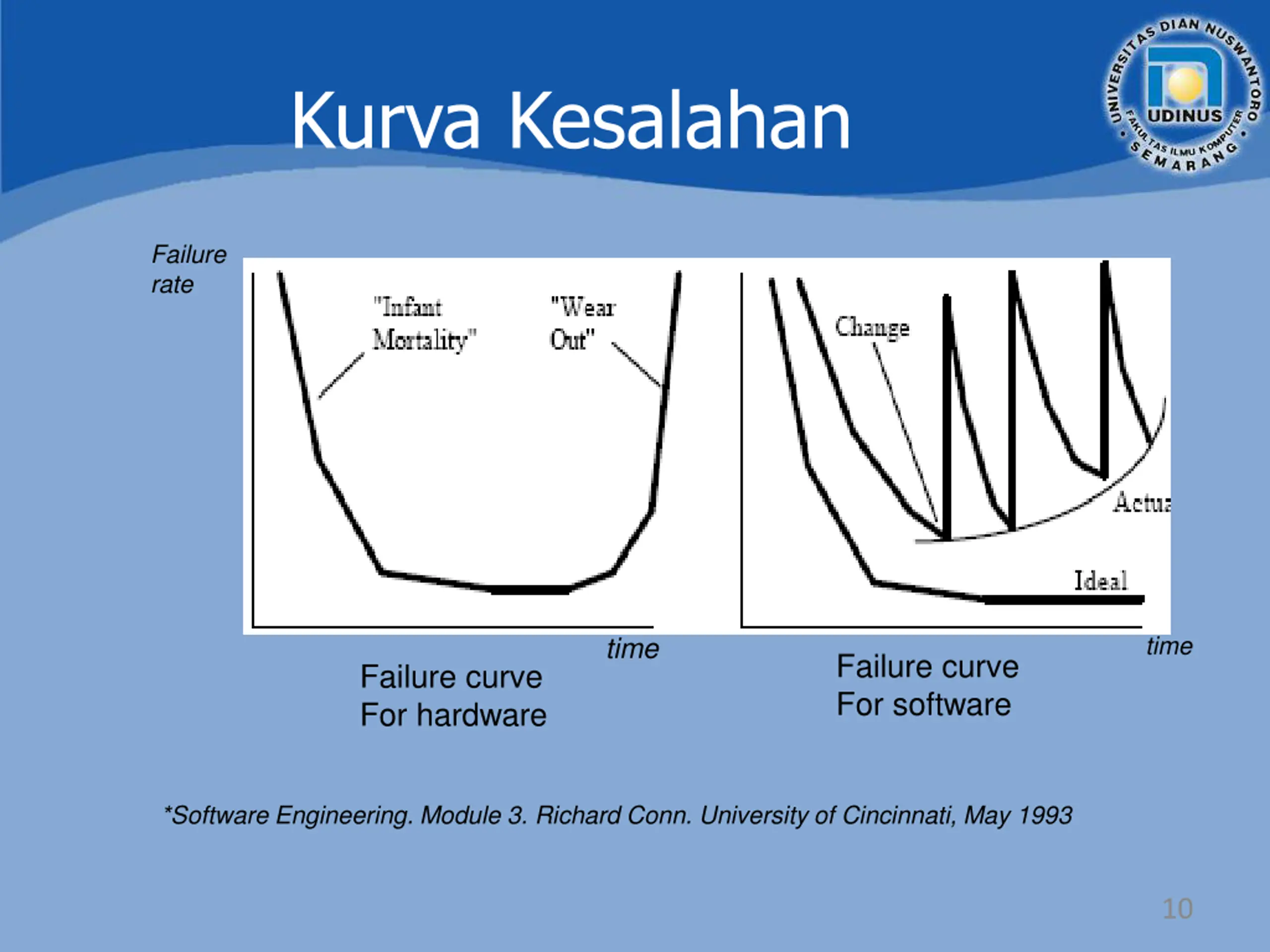 Kurva Kesalahan Failure rate time time Failure curve For software Failure curve For hardware *Software Engineering. Module 3. Richard Conn. University of Cincinnati, May 1993 10
