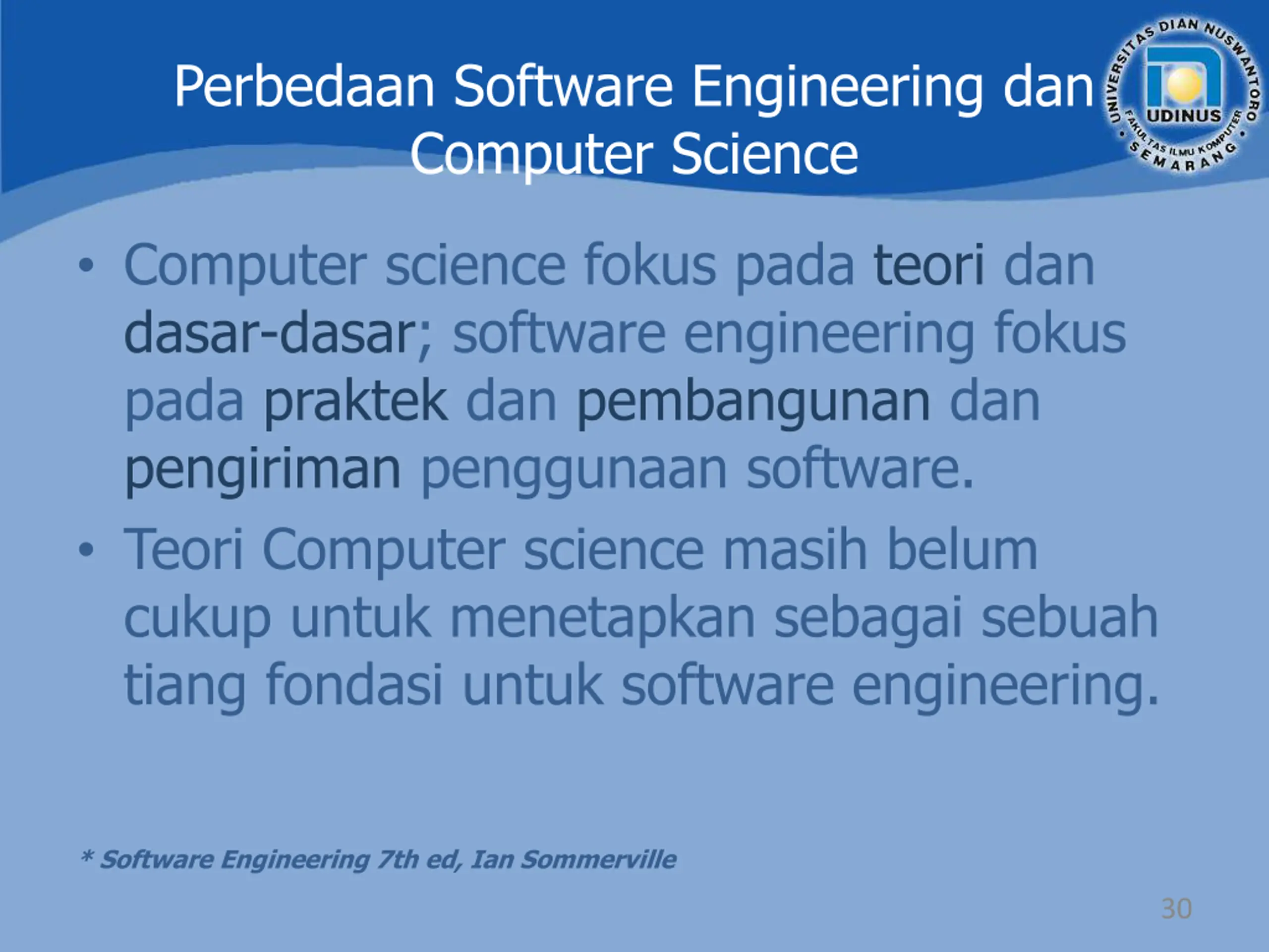 Perbedaan Software Engineering dan Computer Science Computer science fokus pada teori dan dasar-dasar; software engineering fokus pada praktek dan pembangunan dan pengiriman penggunaan software. Teori Computer science masih belum cukup untuk menetapkan sebagai sebuah tiang fondasi untuk software engineering. * Software Engineering 7th ed, Ian Sommerville 30