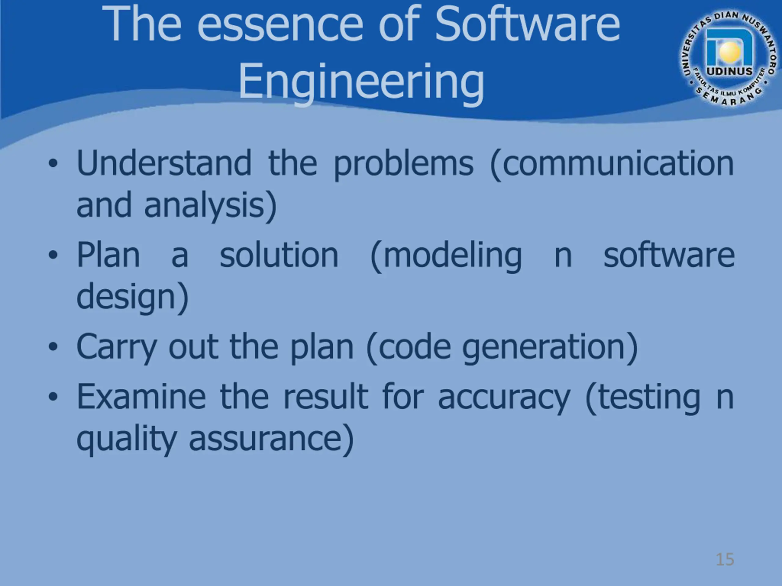 The essence of Software Engineering Understand the problems (communication and analysis) Plan a solution (modeling n software design) Carry out the plan (code generation) Examine the result for accuracy (testing n quality assurance) 15