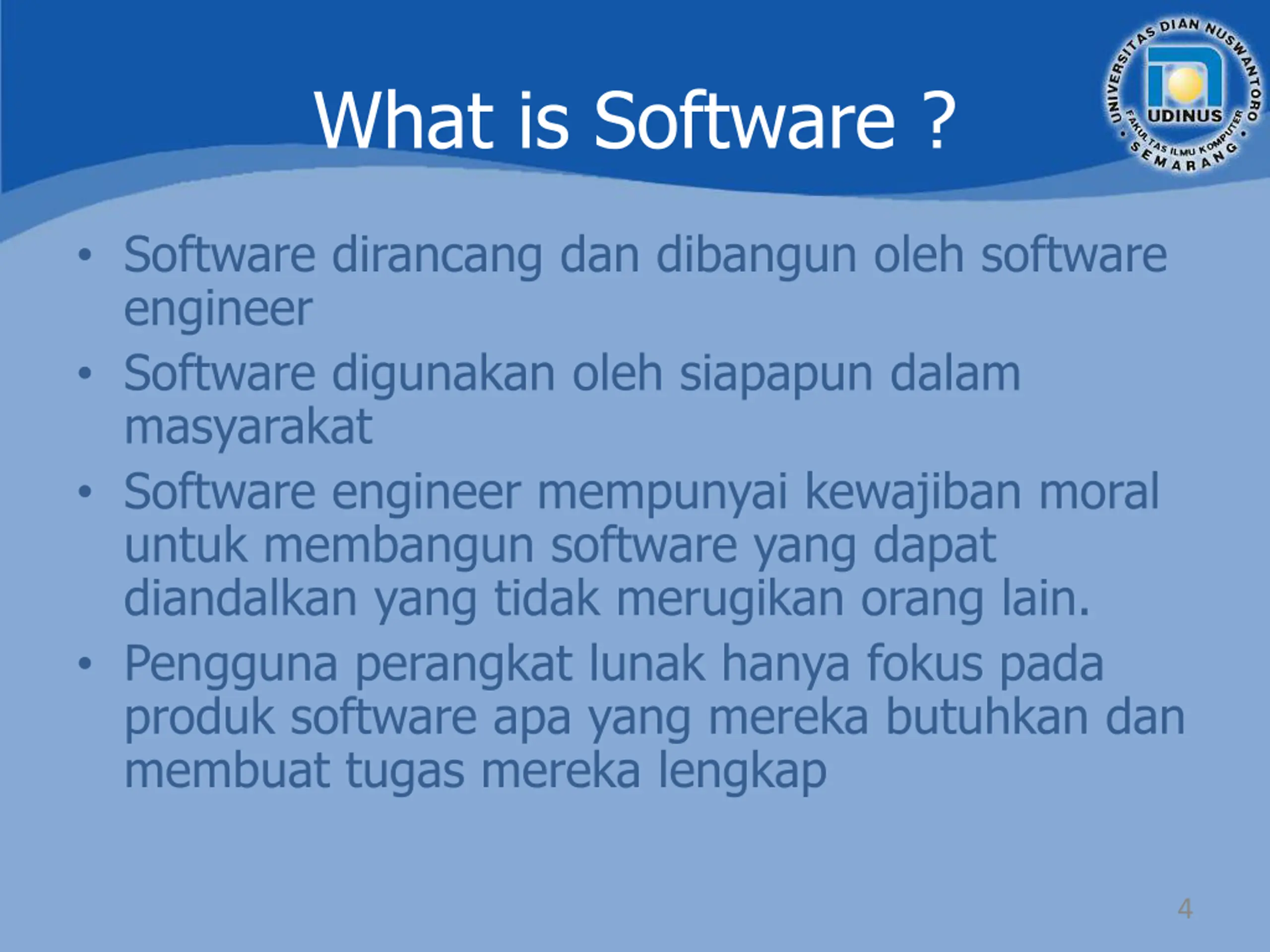 What is Software ? Definisi Software menurut IEEE : Computer programs, procedures, and possibly associated, documentation and data partaining to the operation of a computer system ( IEEE Standard Glossary of Software Engineering Therminology, 1990 ) 3