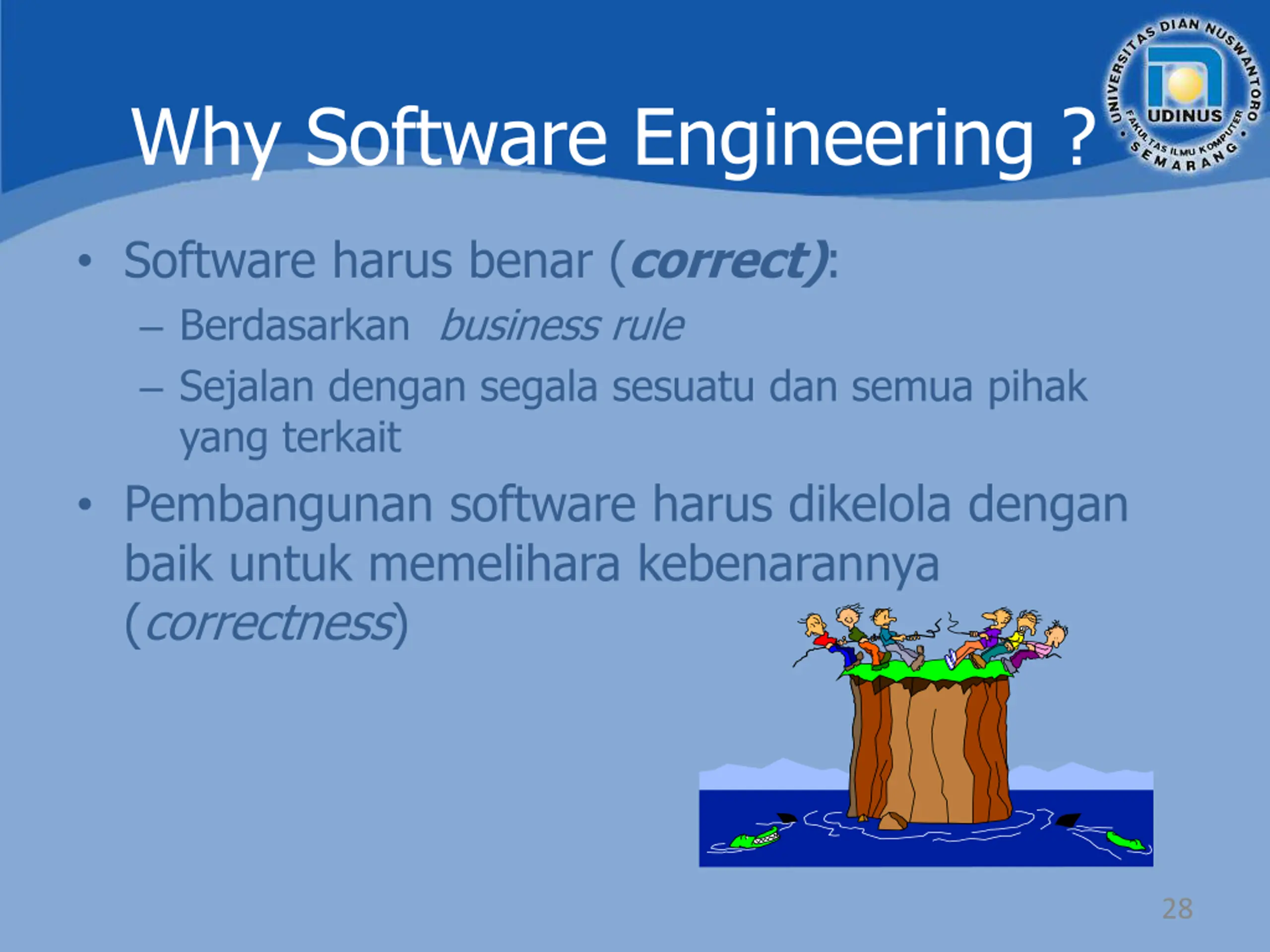 Why Software Engineering ? Untuk mendapatkan software yang benar dan untuk membuat software menjadi benar Software adalah sesuatu yang kompleks dalam hal: Domain problem: Business Rule Data size: Digital and Non Digital Solution: Algorithm Place or Sites 27